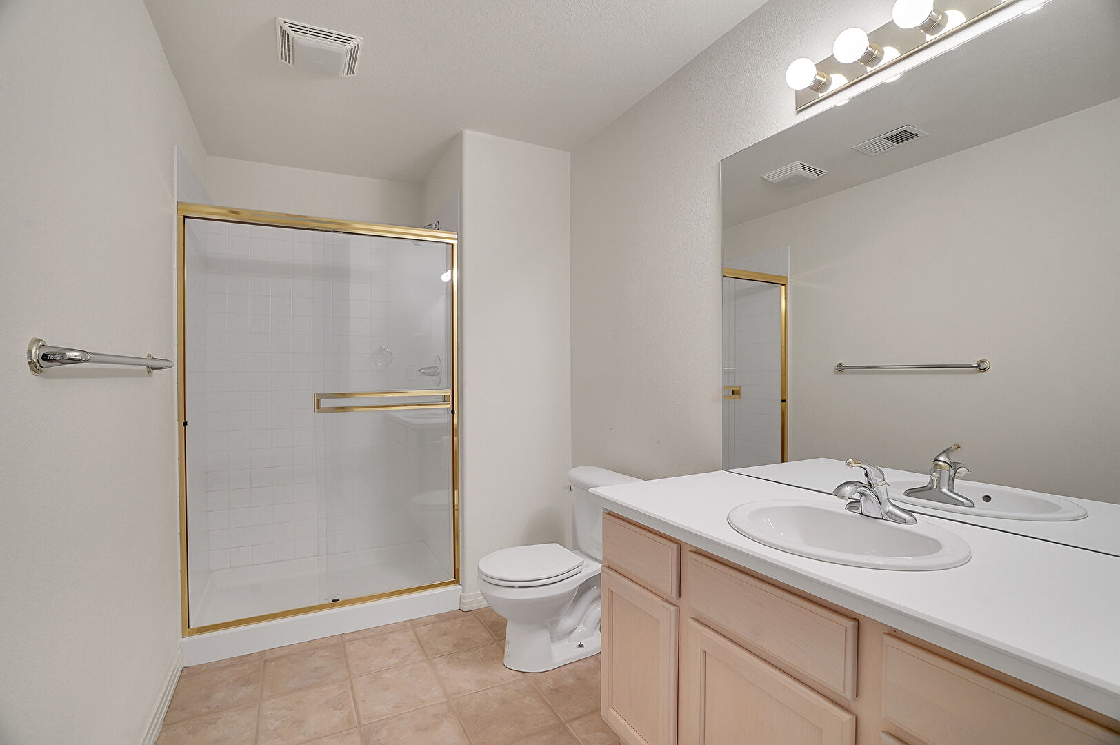 Baseboards Wall, Double Vanity, Drywall, Full Bathroom, Natural Light, Tile Floor, Vanity, Vent, Walk In Closet, Full Bathroom, Natural Light, Water Closet