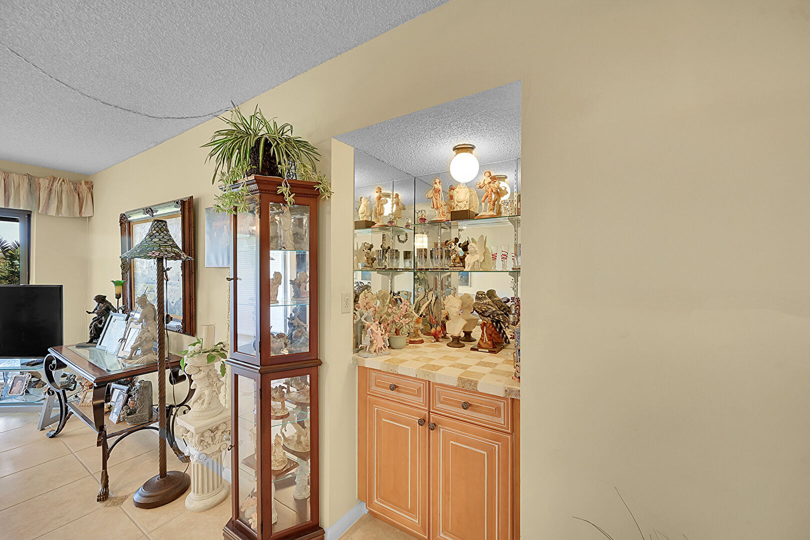 Arched Cabinets, Baseboards Wall, Crown Molding Cabinets, Drywall, Glass Insert Cabinets, Medium Brown Cabinets, Natural Light, Notable Chandelier, Open Shelves, Raised Cabinets, Stone Countertops, Textured Ceiling, Tile Floor, Open Shelves, Raised Cabinets, Tile Floor