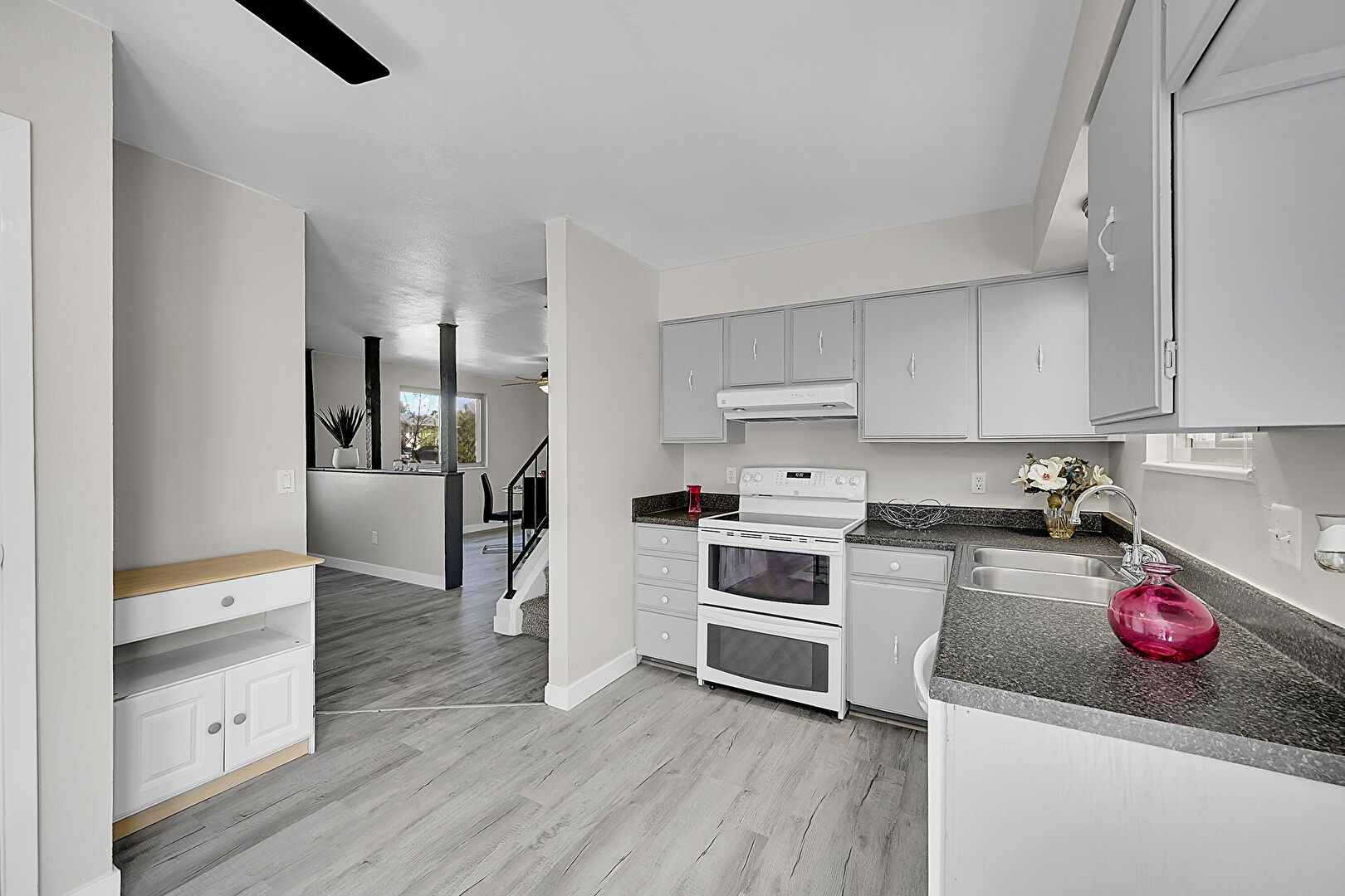 Baseboards Wall, Ceiling Fan, Drywall, Gray Cabinets, Natural Light, Vent, Wood Finish Floor, Drywall, Natural Light