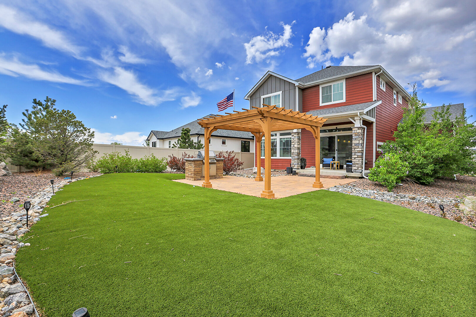 Board Batten Siding, Downspout, Fence, Grill, Gutters, Horizontal Siding, Lawn, Outdoor Kitchen, Patio, Pergola, Shingle Roof, Stone Siding, Vertical Siding, Board Batten Siding, Fence