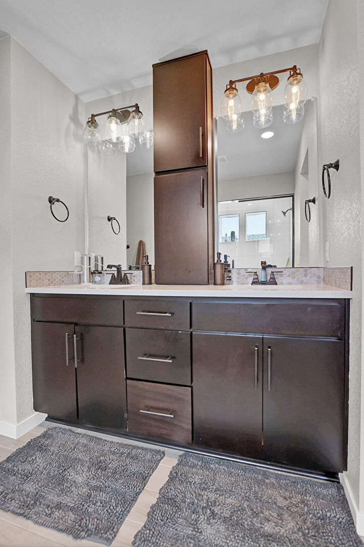 Baseboards Wall, Combined Bath Shower, Double Vanity, Drywall, Full Bathroom, Half Bathroom, Natural Light, Textured Wall, Tile Floor, Vanity, Vent, Wood Finish Floor, Combined Bath Shower, Drywall, Full Bathroom, Vanity, Vent, Wood Finish Floor