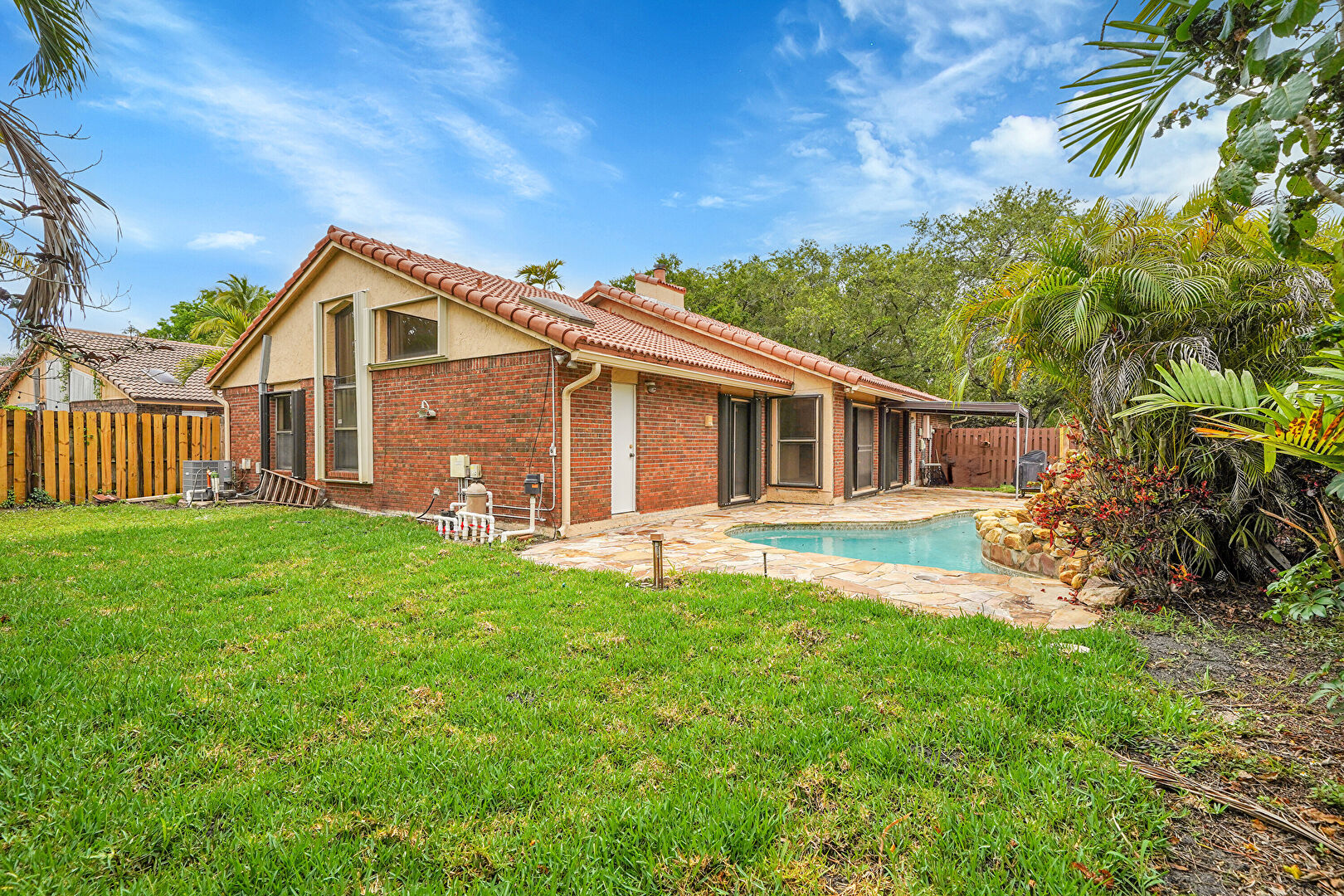 Chimney, Downspout, Fence, Gutters, Lawn, Patio, Pool, Stucco Siding, Tile Roof, Brick Siding