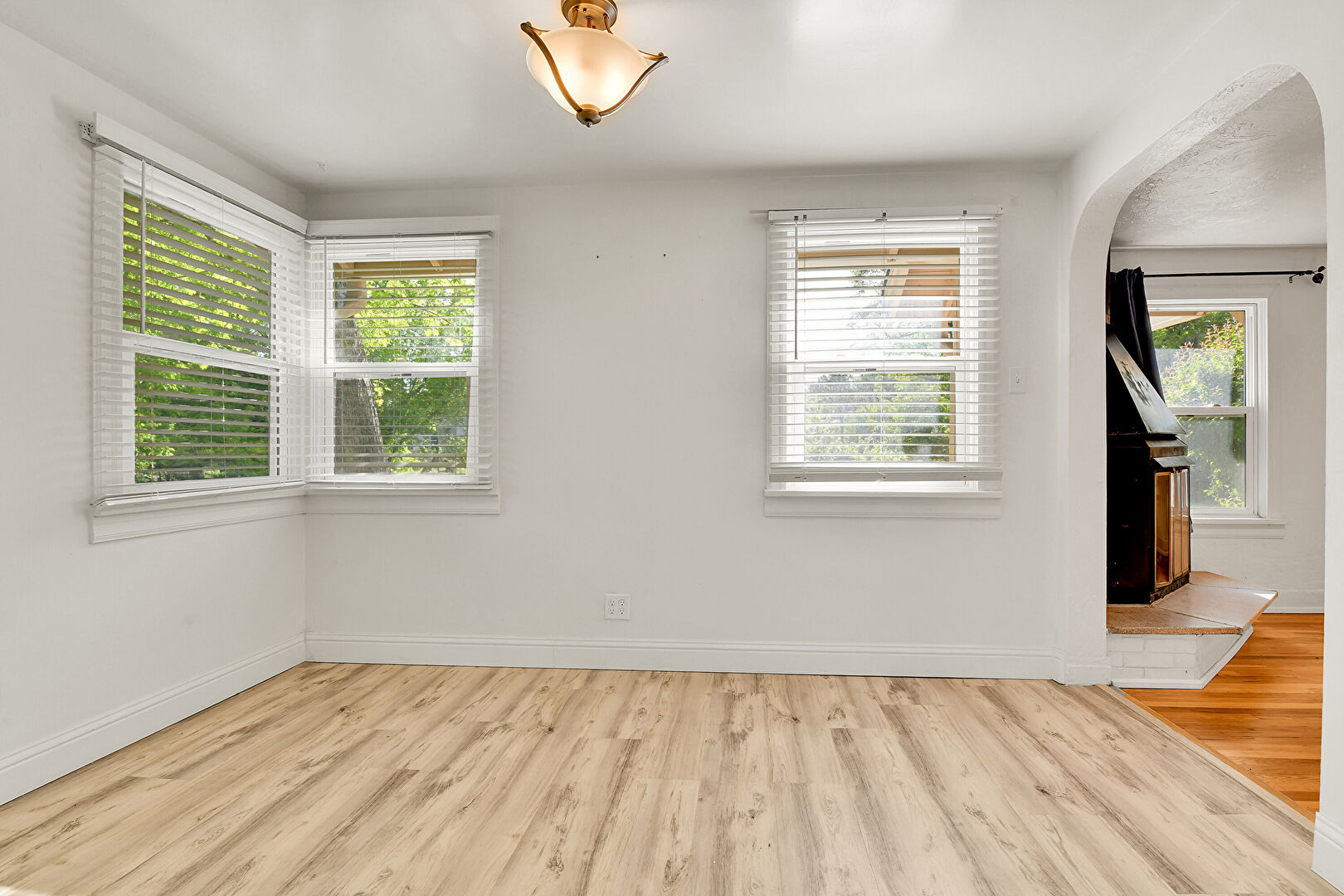 Arched Walkways, Baseboards Wall, Drywall, Fireplace, Natural Light, Vent, Wood Finish Floor, Arched Walkways, Drywall, Natural Light