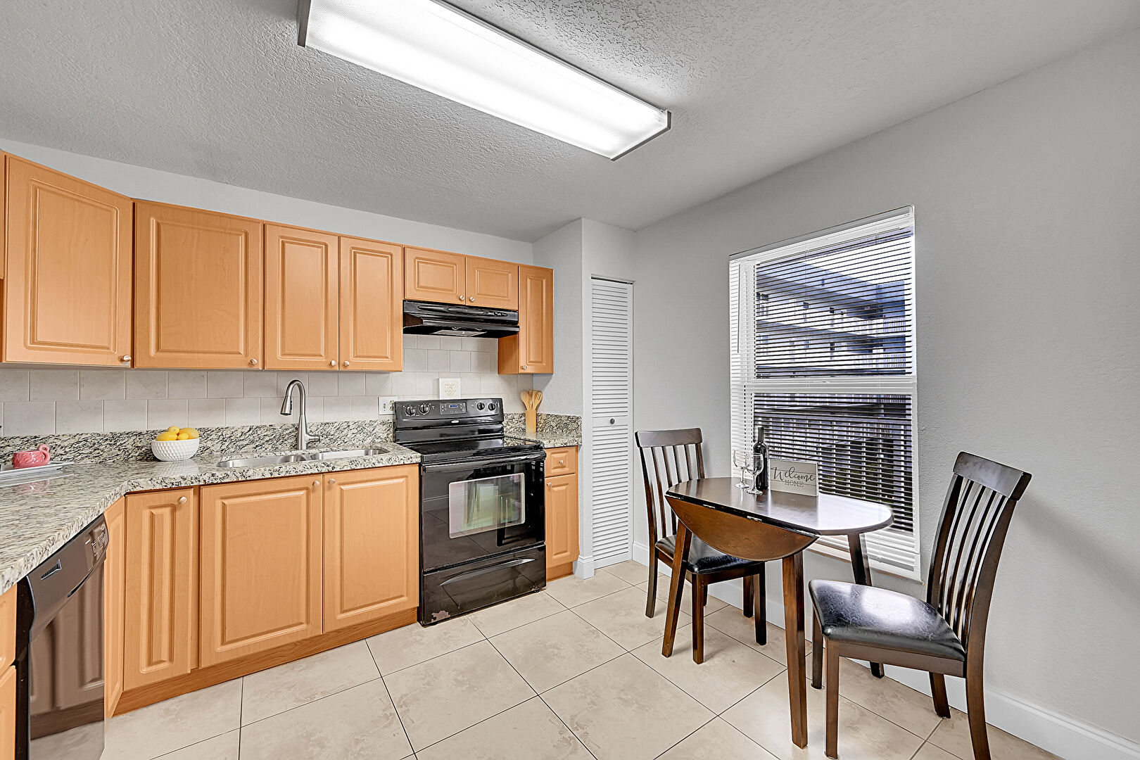 Baseboards Wall, Drywall, L Shaped Kitchen, Natural Light, Pass Through Window, Raised Cabinets, Stone Countertops, Textured Ceiling, Tile Floor, Vent, Drywall, Tile Floor