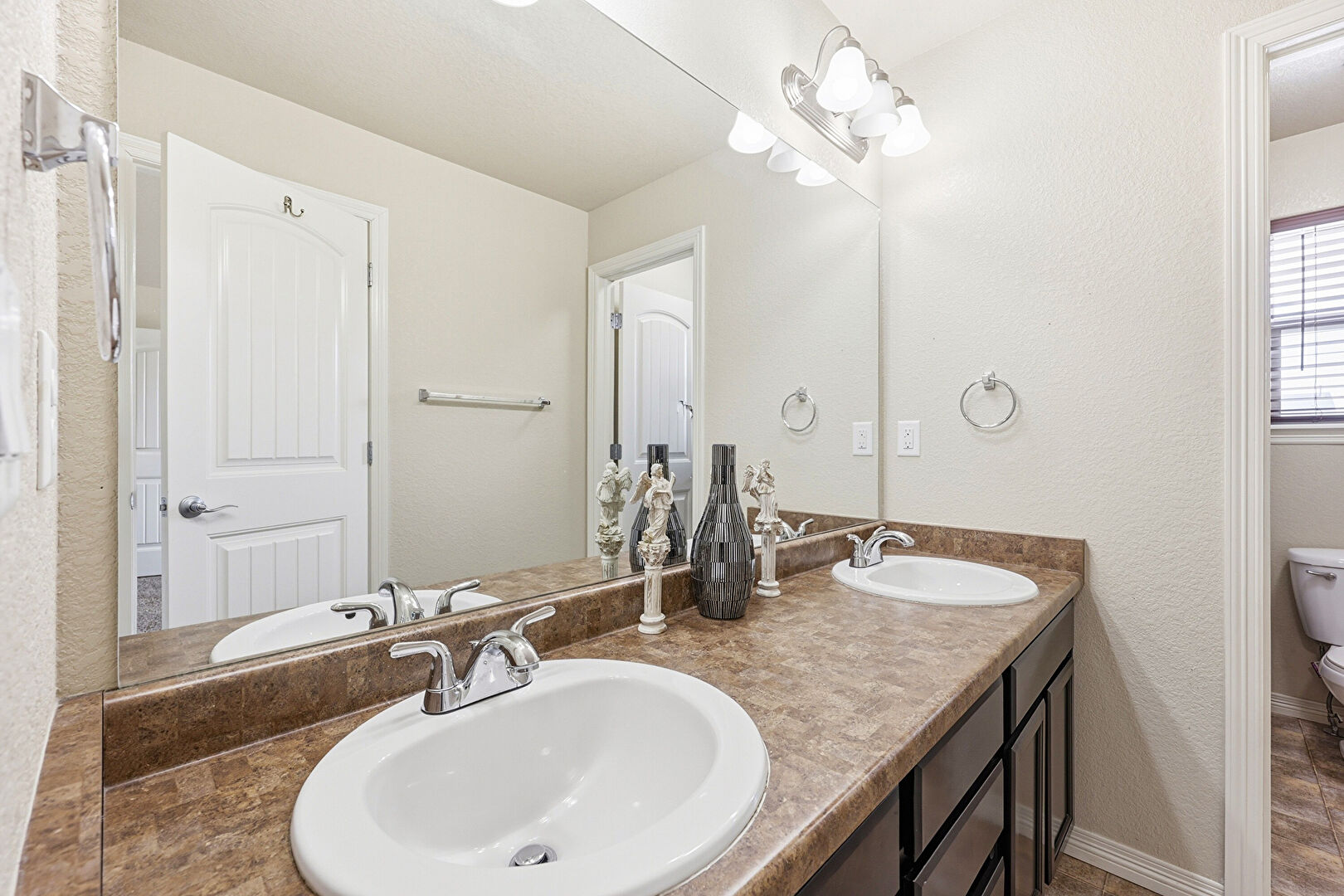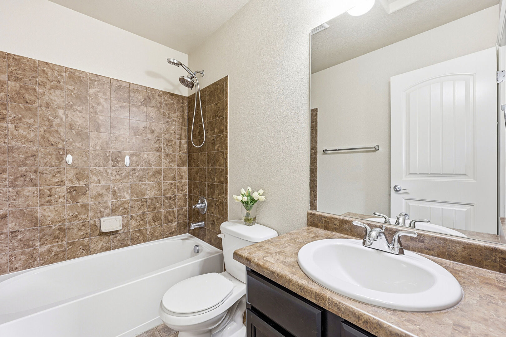 Baseboards Wall, Combined Bath Shower, Double Vanity, Full Bathroom, Natural Light, Textured Wall, Water Closet, Full Bathroom, Textured Wall