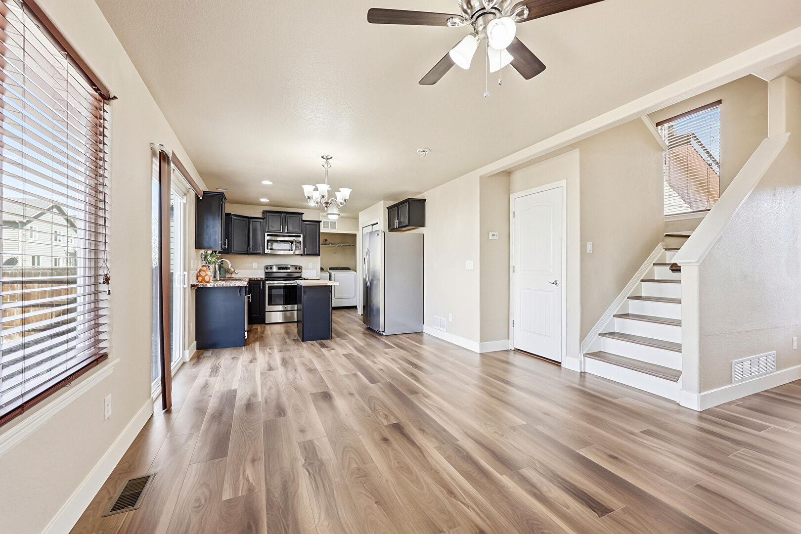 Baseboards Wall, Ceiling Fan, Drywall, Natural Light, Recessed Lighting, Wood Finish Floor, Notable Chandelier
