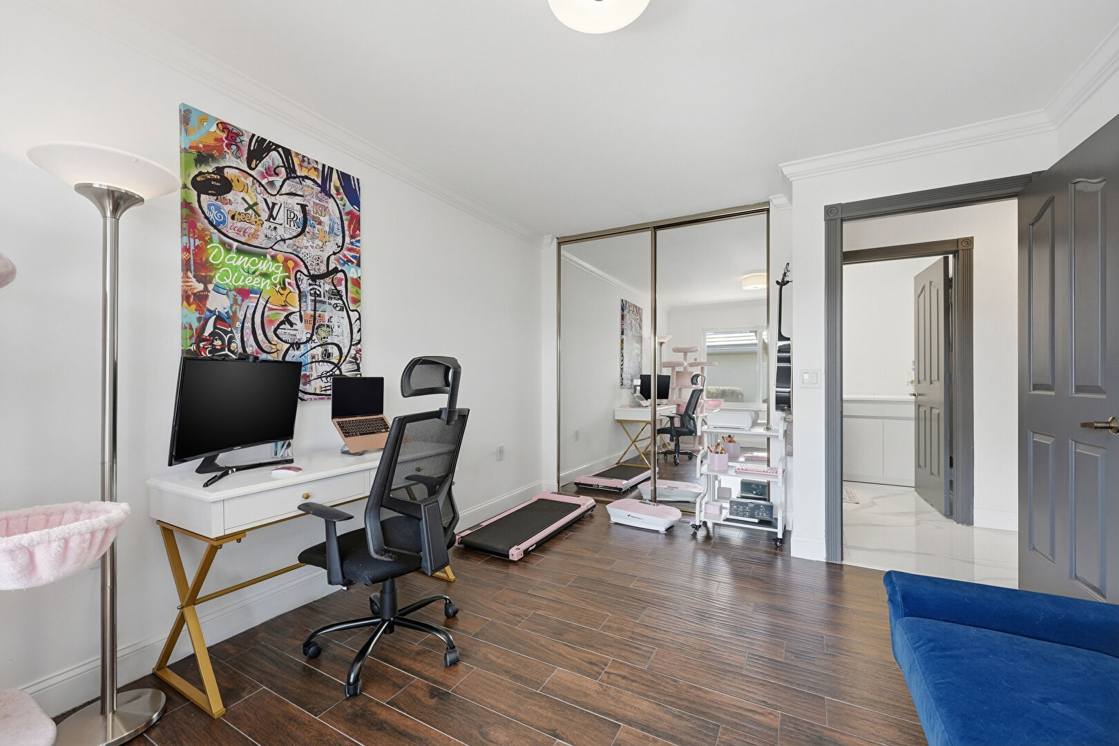 Baseboards Wall, Closet, Crown Molding, Drywall, High Ceiling, Natural Light, Office Area, Vaulted Ceiling, Vent, Wood Finish Floor, Crown Molding, Drywall, Notable Chandelier