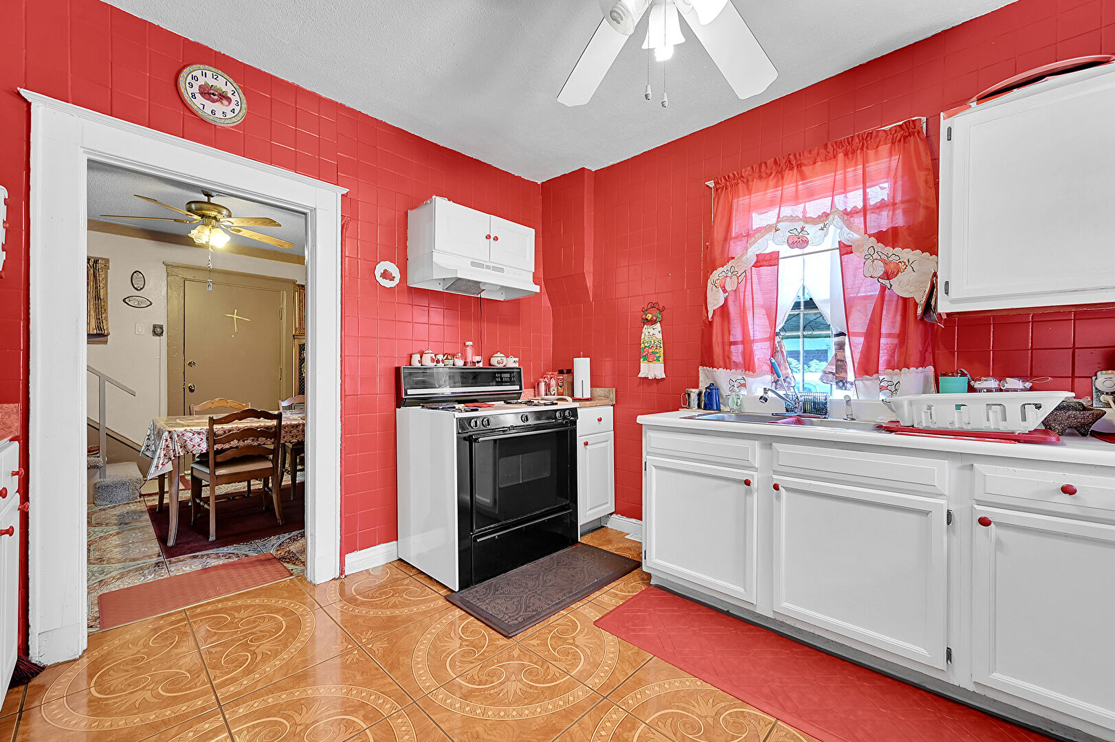 Ceiling Fan, Natural Light, Raised Cabinets, Shaker Cabinets, Textured Ceiling, Tile Floor, Tile Wall, Visible Hinge Cabinets, Natural Light, Vaulted Ceiling, Visible Hinge Cabinets