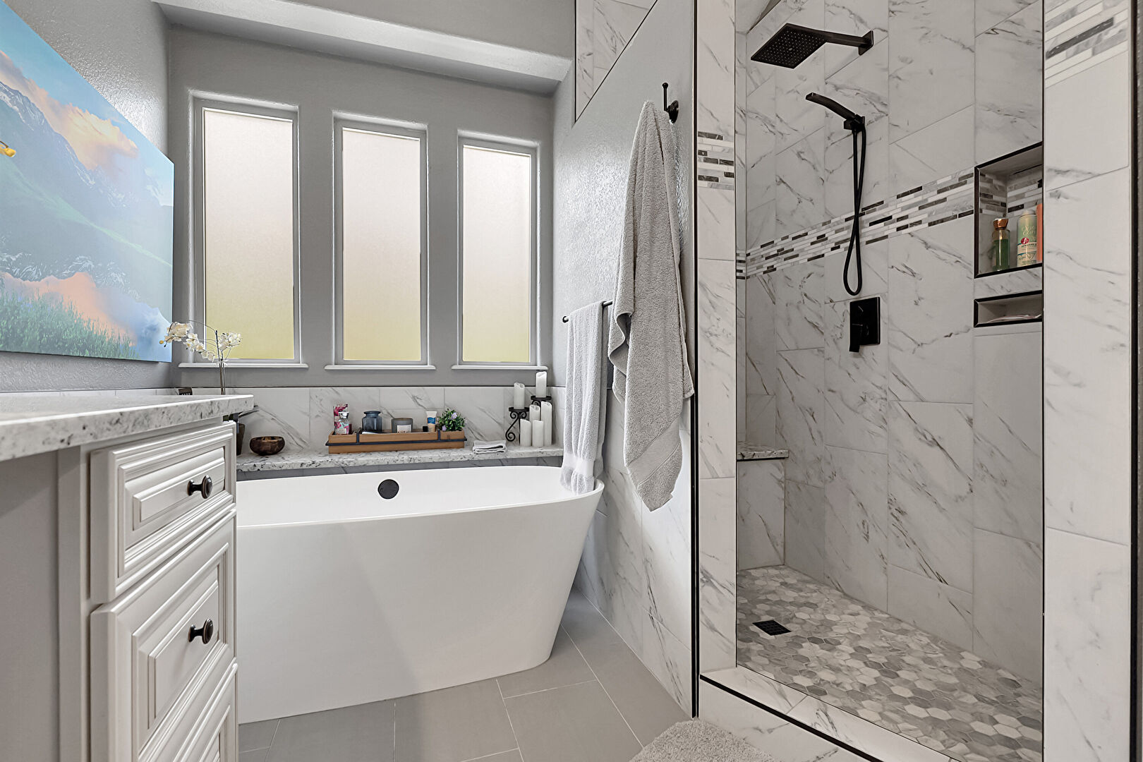 Baseboards Wall, Double Vanity, Drywall, Full Bathroom, Natural Light, Recessed Lighting, Tile Floor, Tile Wall, Two Single Vanities, Vanity, Vaulted Ceiling, Vent, Baseboards Wall, Drywall, Natural Light, Recessed Lighting, Tile Floor, Vaulted Ceiling