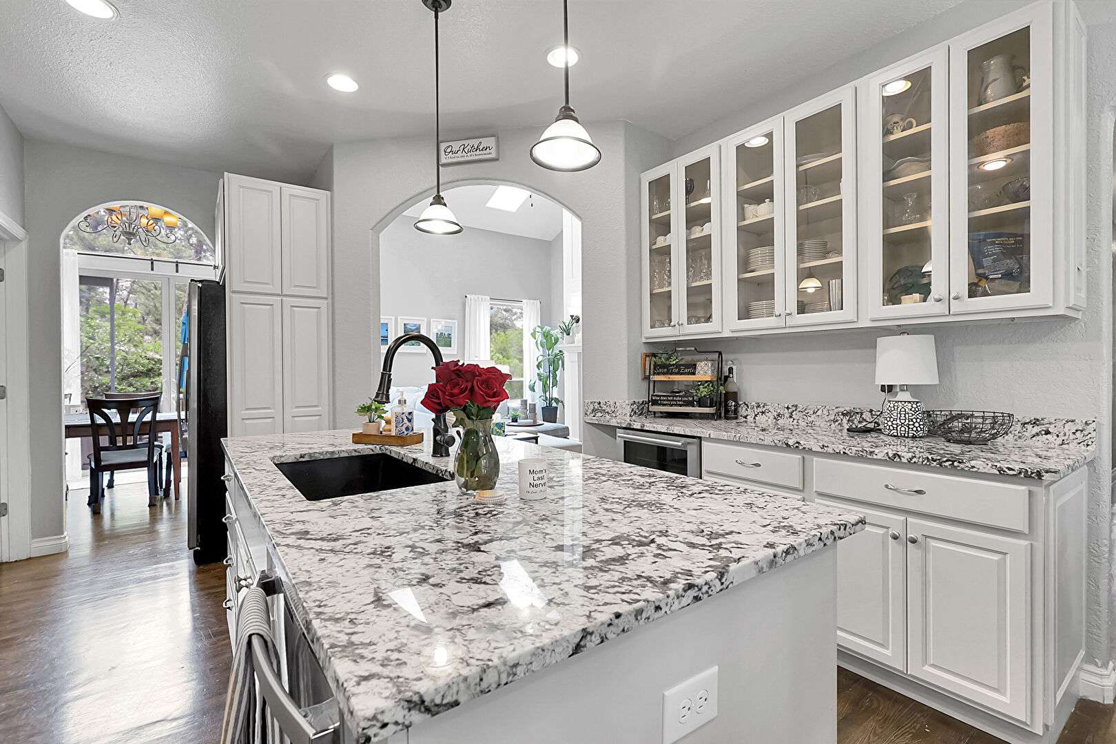 Arched Walkways, Baseboards Wall, Drywall, Glass Insert Cabinets, Indoor Bar, Kitchen Island, Natural Light, Open Shelves, Opens To Living Area, Pendant Lighting, Raised Cabinets, Recessed Lighting, Stone Countertops, Textured Ceiling, Wine Cooler, Wood Finish Floor, Kitchen Island, Pendant Lighting, Raised Cabinets, Textured Wall, Wood Finish Floor
