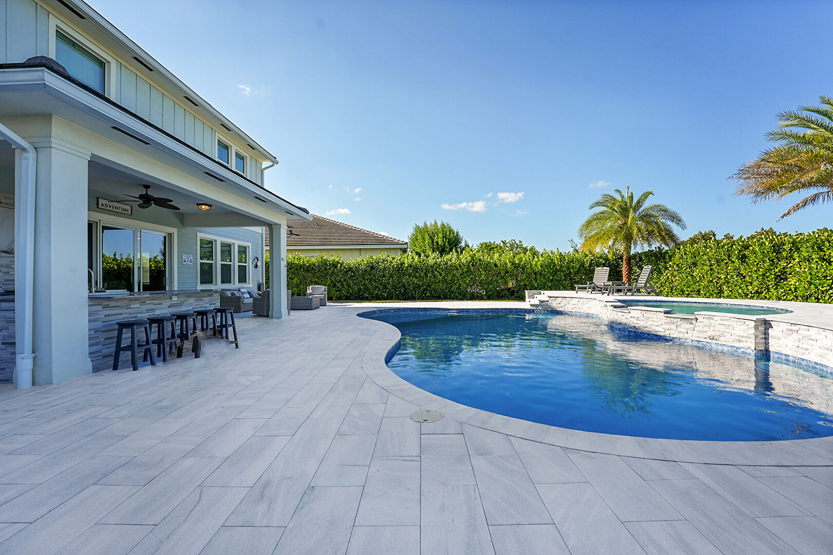 Ceiling Fan, Fence, Hot Tub, Outdoor Dining Area, Outdoor Kitchen, Outdoor Living Space, Patio, Pool, Pool Hot Tub Combo, Fence, Outdoor Bar, Pool, Pool Hot Tub Combo