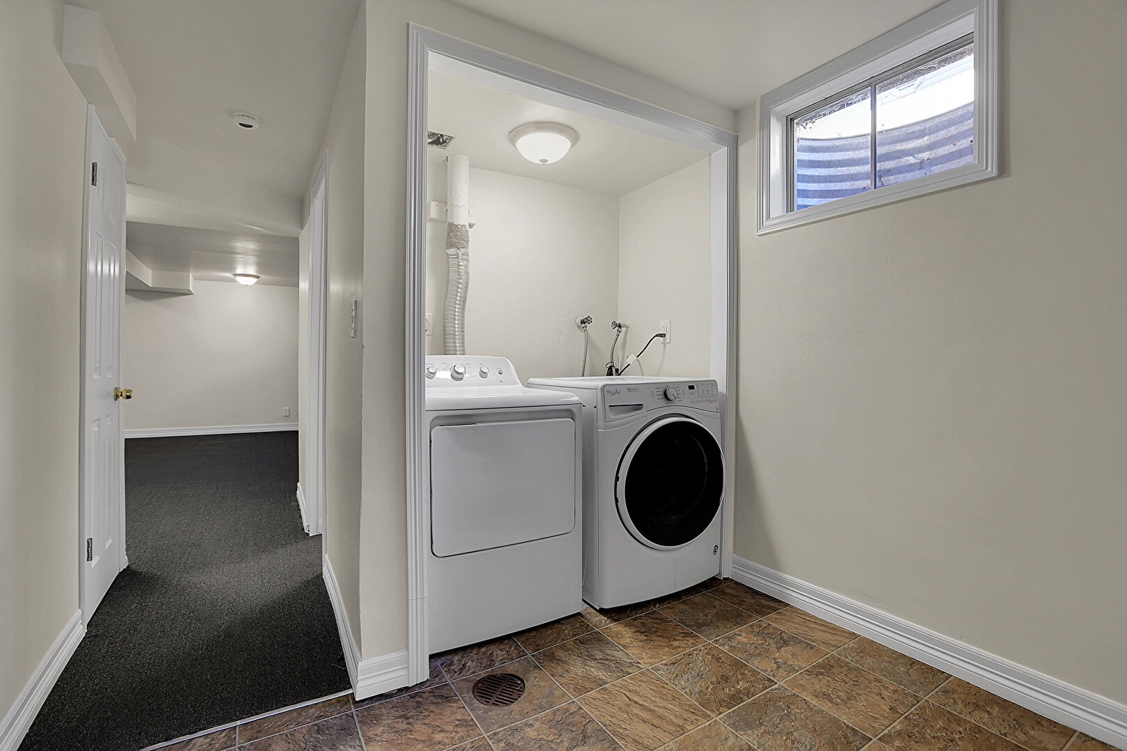 Baseboards Wall, Basement, Carpet, Drywall, Natural Light, Stone Finish Floor, Washer Hookup, Laundry