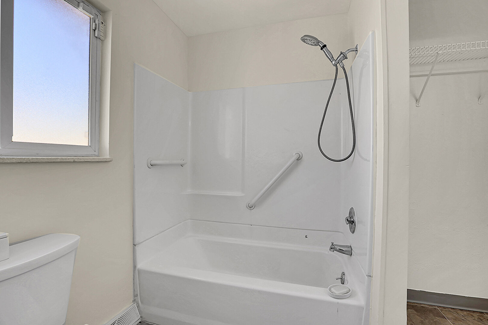 Baseboards Wall, Closet, Combined Bath Shower, Drywall, Full Bathroom, Natural Light, Tile Floor