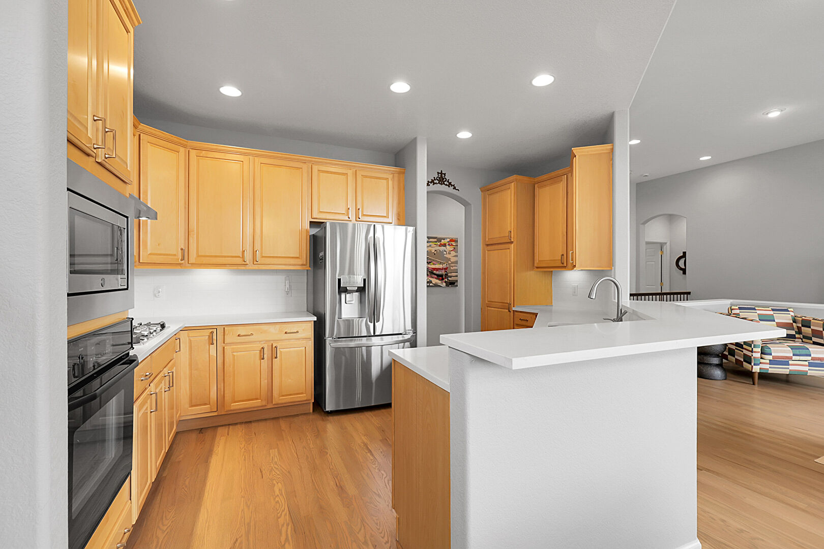 Arched Walkways, Baseboards Wall, Crown Molding Cabinets, Drywall, Fireplace, G Shaped Kitchen, Kitchen Bar, Kitchen Peninsula, Natural Light, Opens To Living Area, Pass Through Window, Pendant Lighting, Raised Cabinets, Recessed Lighting, Stone Countertops, Wood Finish Floor, Baseboards Wall, Ceiling Fan, Crown Molding Cabinets, Kitchen Peninsula, Pendant Lighting, Raised Cabinets, Stone Countertops