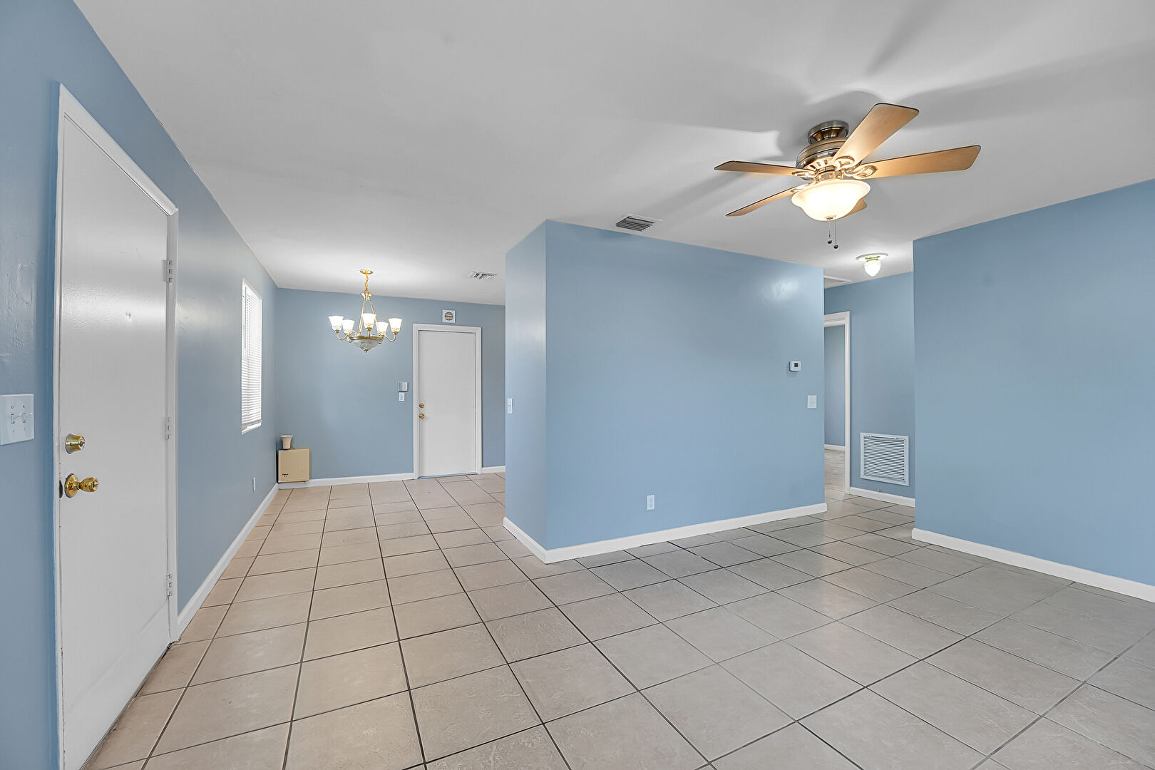Baseboards Wall, Ceiling Fan, Drywall, Natural Light, Notable Chandelier, Tile Floor, Vent, Natural Light, Tile Floor
