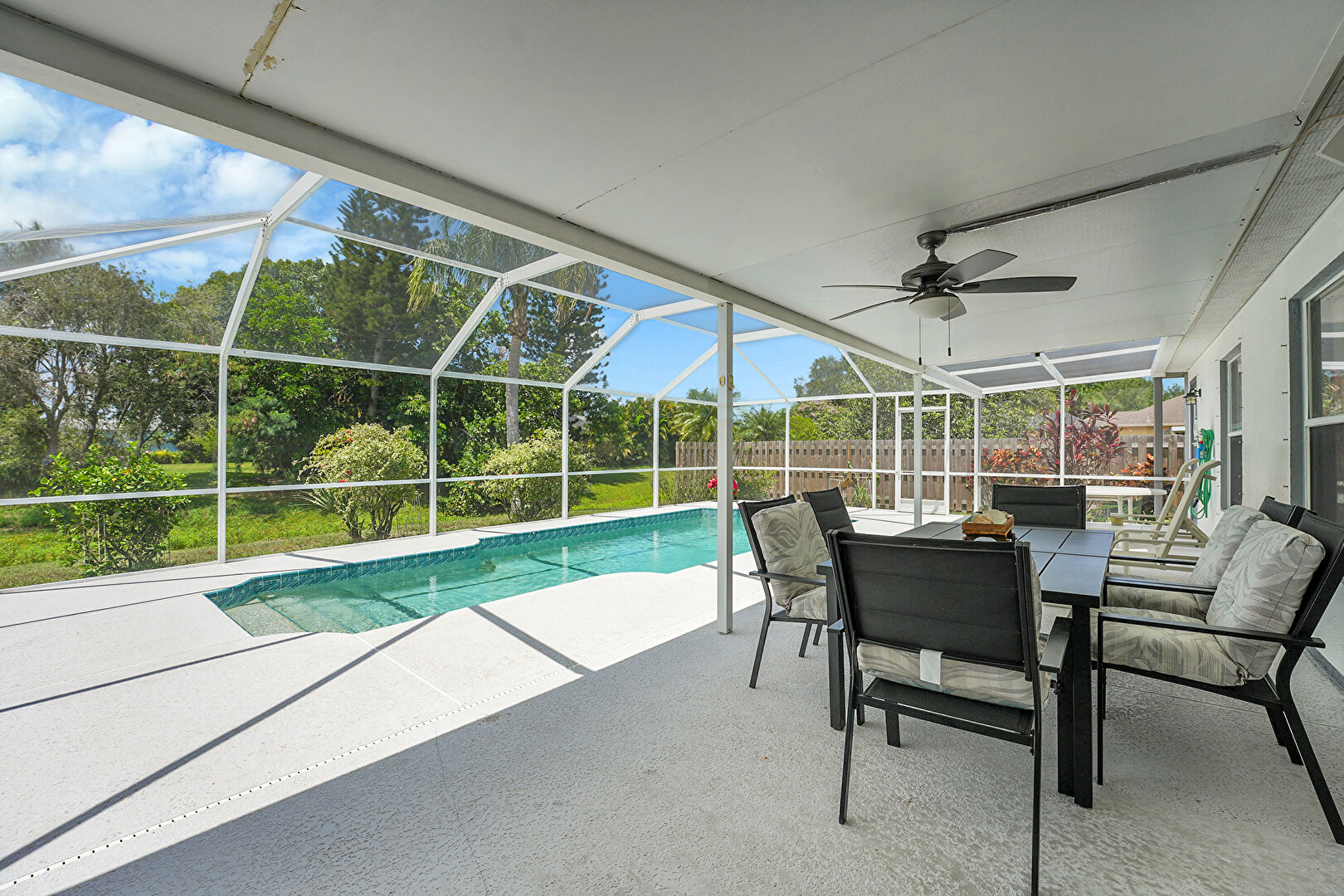 Ceiling Fan, Fence, Lanai, Outdoor Dining Area, Patio, Pool, Woods View, Ceiling Fan, Outdoor Dining Area, Patio