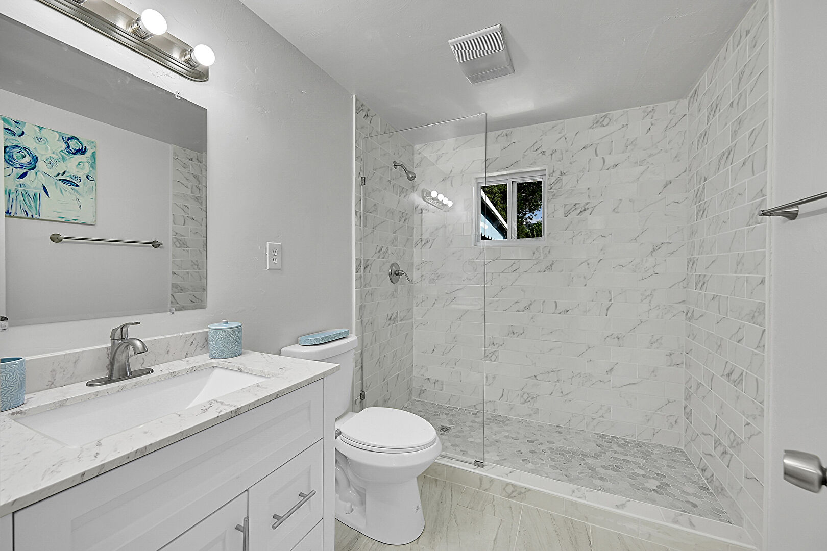 Drywall, Full Bathroom, Natural Light, Vanity, Vent, Marble Finish Floor
