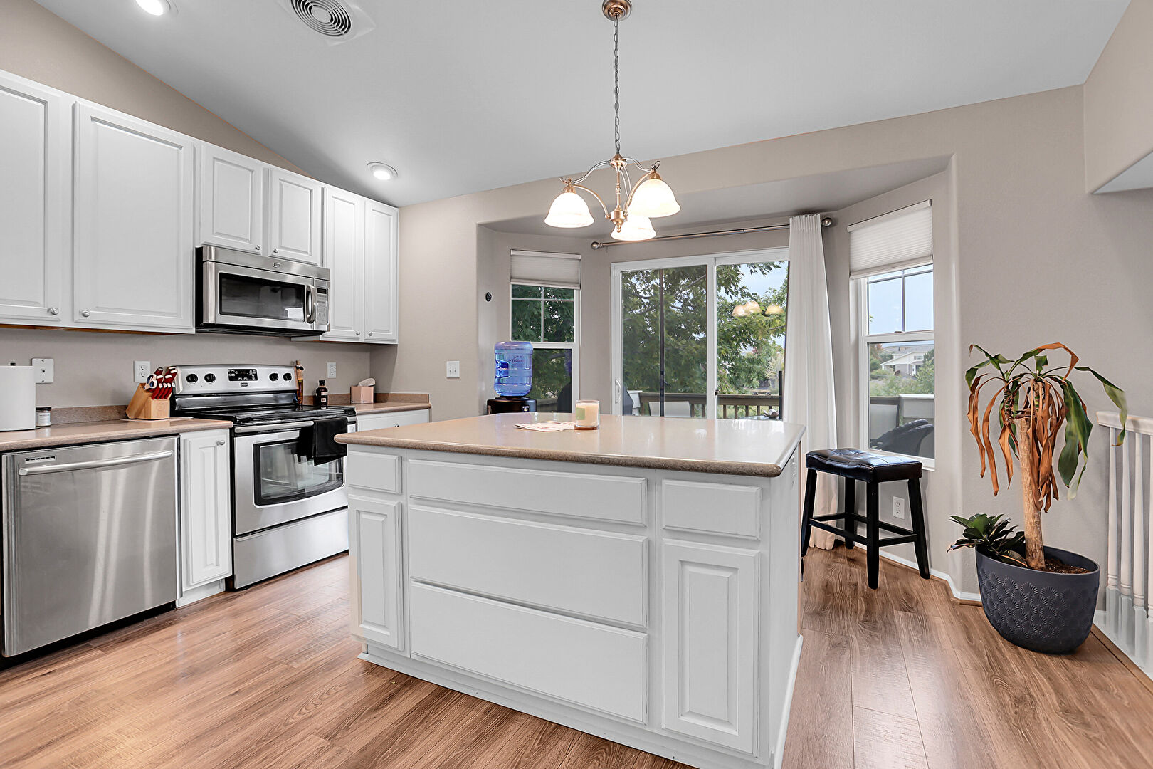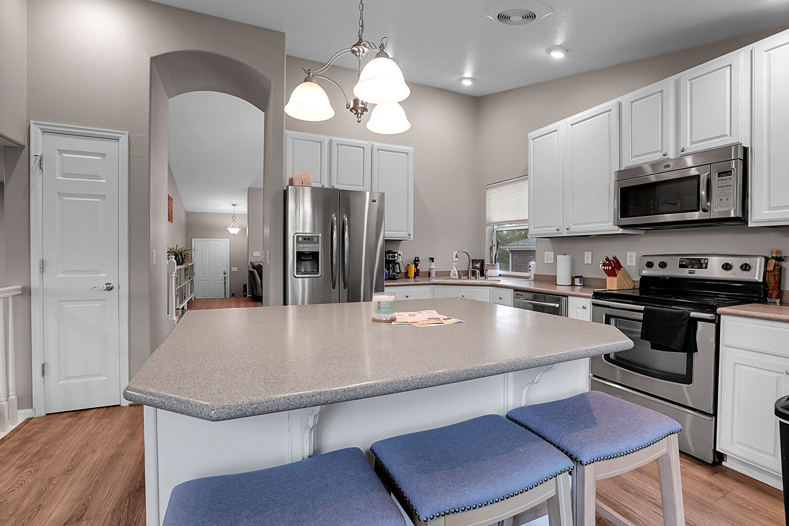 Arched Walkways, Baseboards Wall, Drywall, Fireplace, High Ceiling, Kitchen Bar, Kitchen Island, Natural Light, Notable Chandelier, Opens To Living Area, Pendant Lighting, Raised Cabinets, Recessed Lighting, Stone Countertops, Vaulted Ceiling, Vent, Wood Finish Floor, Drywall, Natural Light, Notable Chandelier, Pendant Lighting, Raised Cabinets, Wood Finish Floor