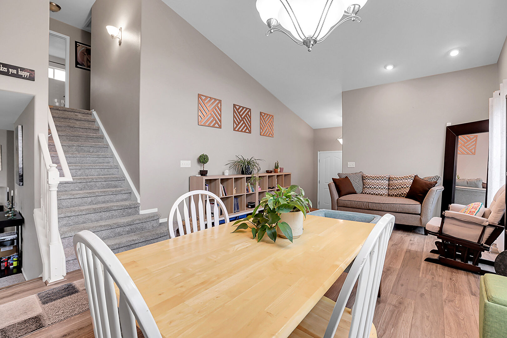 Arched Walkways, Baseboards Wall, Carpet, Drywall, Fireplace, High Ceiling, Natural Light, Notable Chandelier, Recessed Lighting, Stairs, Vaulted Ceiling, Vent, Wood Finish Floor, Drywall, Recessed Lighting, Vaulted Ceiling