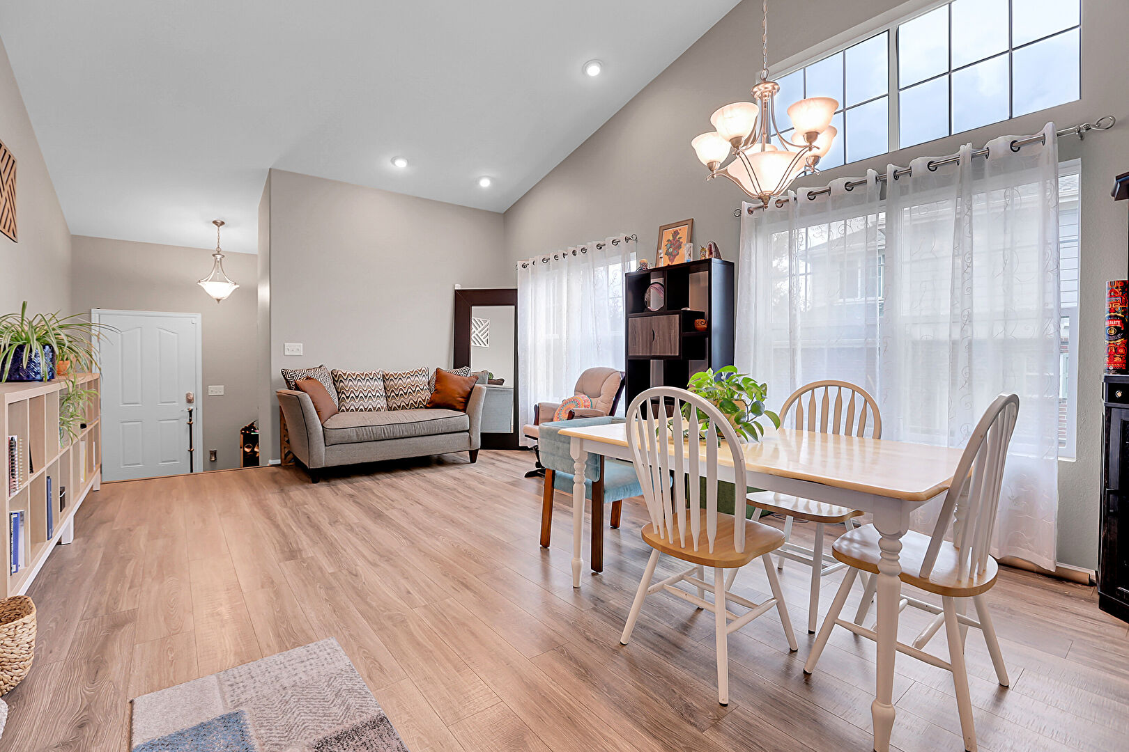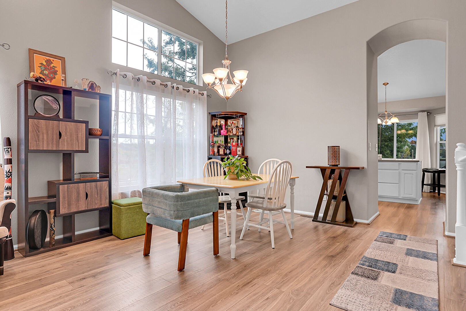 Arched Walkways, Drywall, High Ceiling, Natural Light, Notable Chandelier, Vaulted Ceiling, Wood Finish Floor, Baseboards Wall