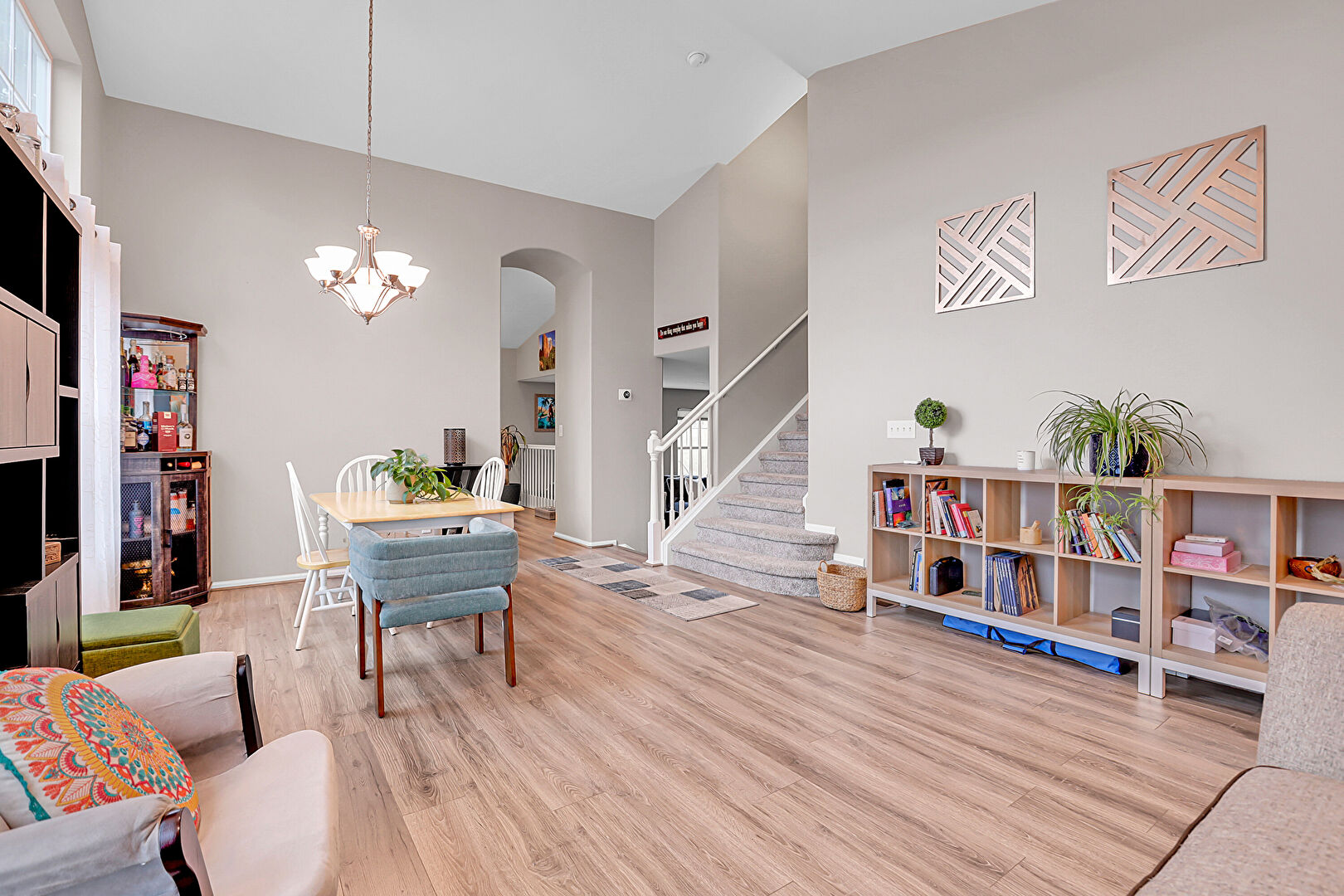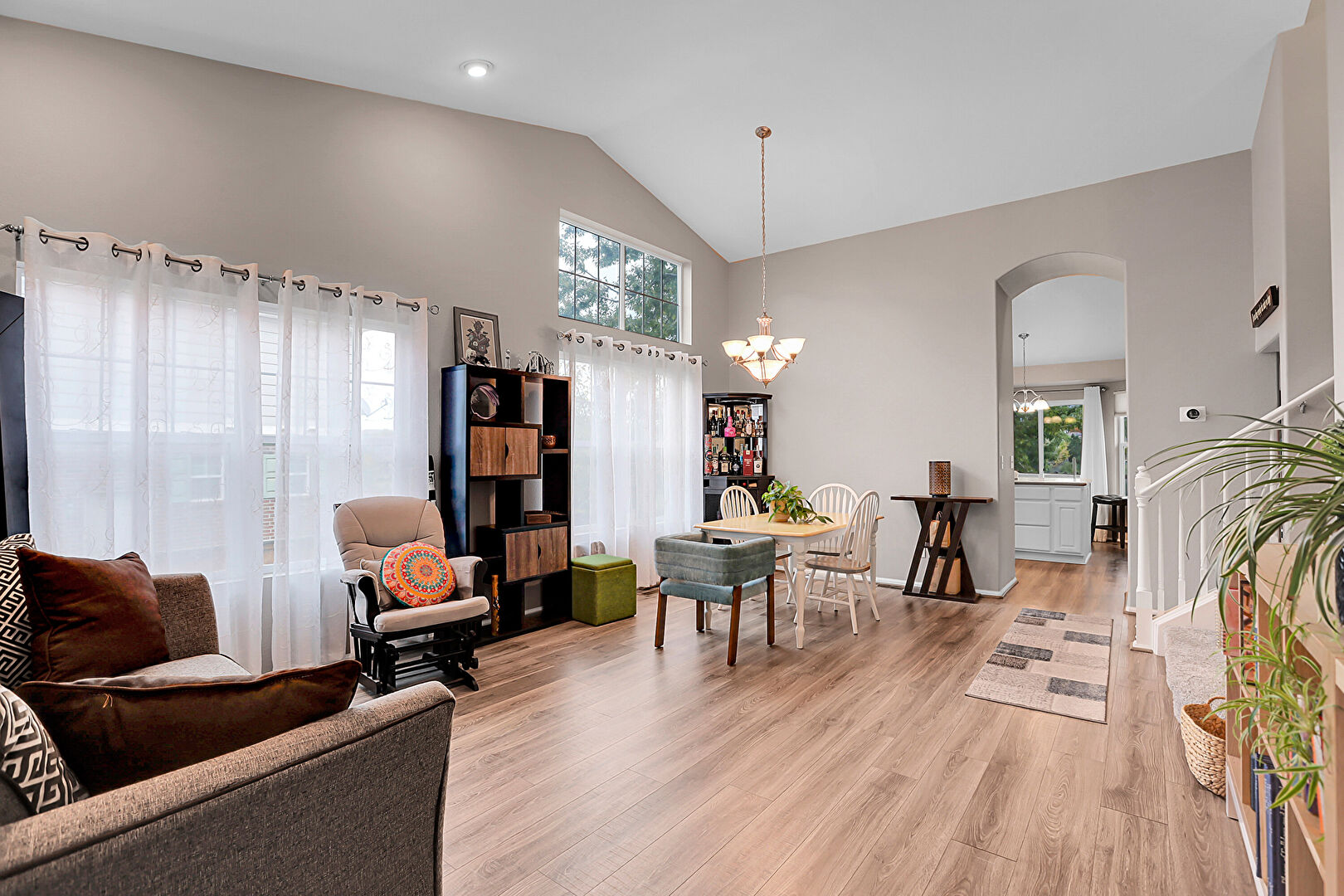 Arched Walkways, Baseboards Wall, Drywall, High Ceiling, Natural Light, Notable Chandelier, Recessed Lighting, Stairs, Vaulted Ceiling, Wood Finish Floor, Arched Walkways, High Ceiling, Vaulted Ceiling