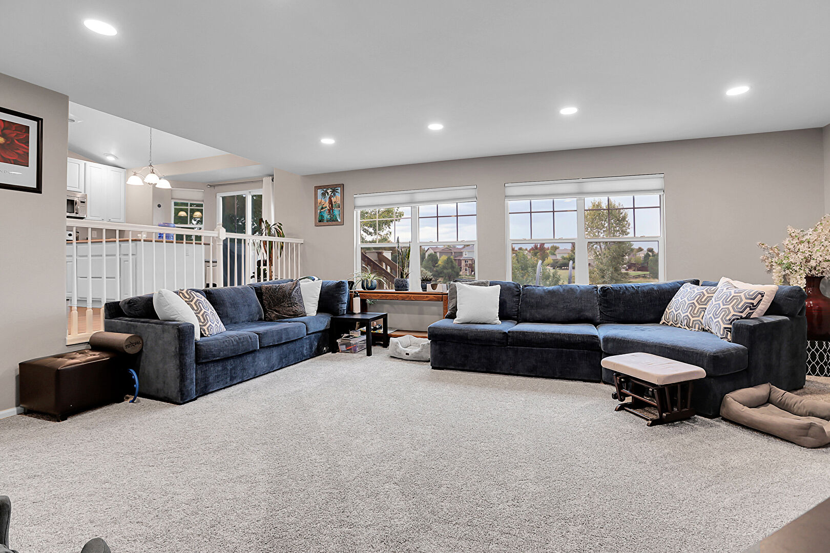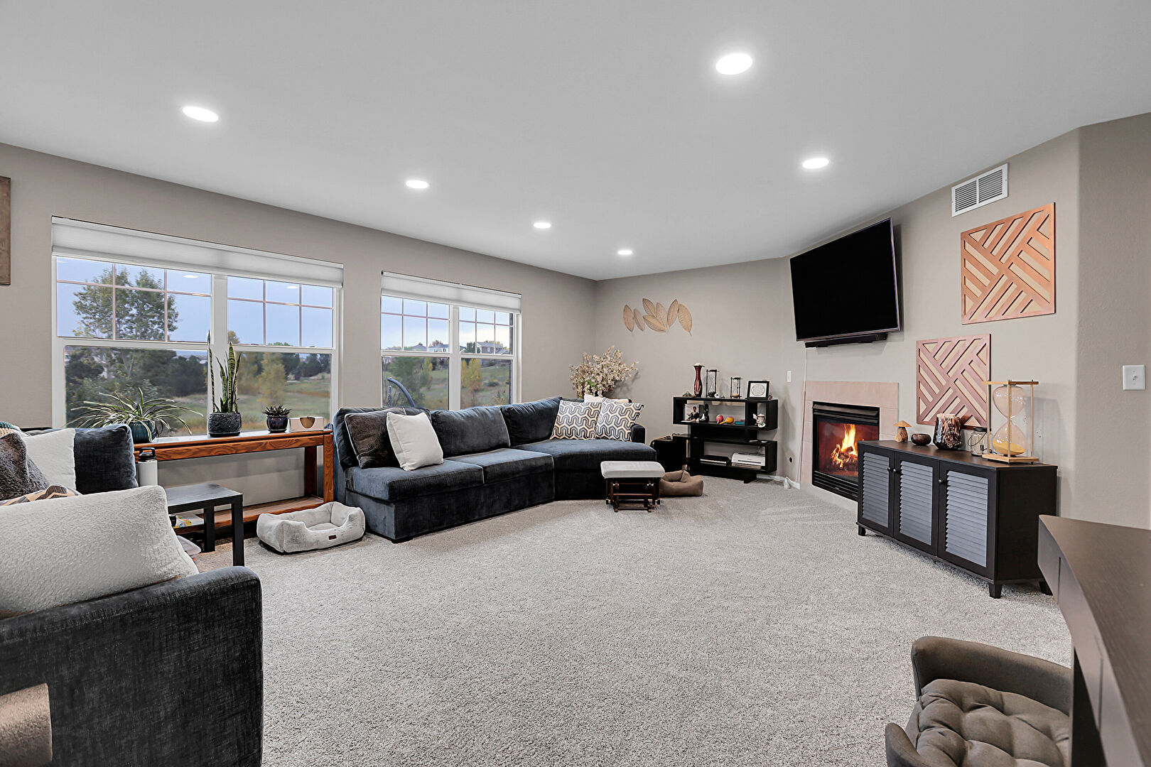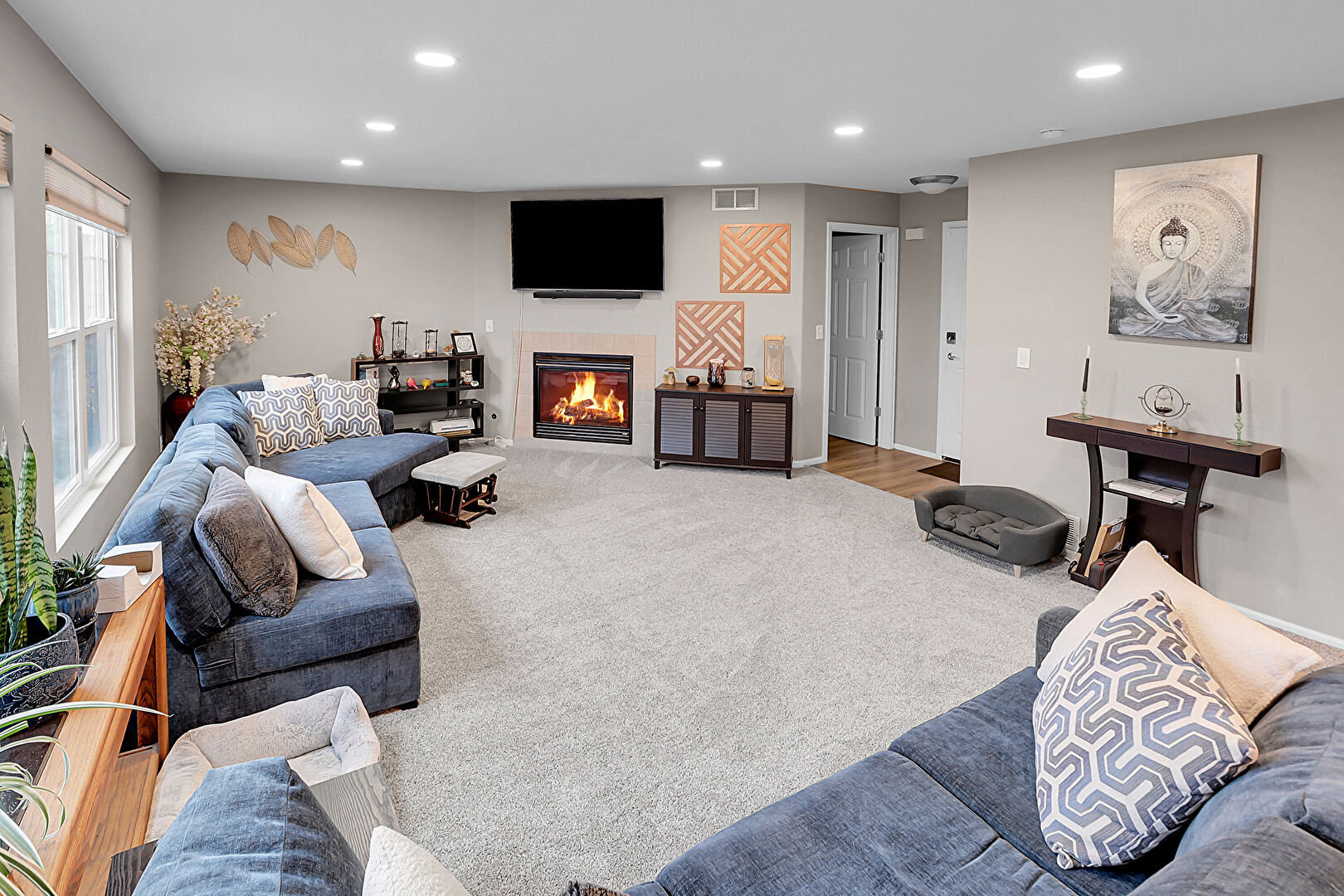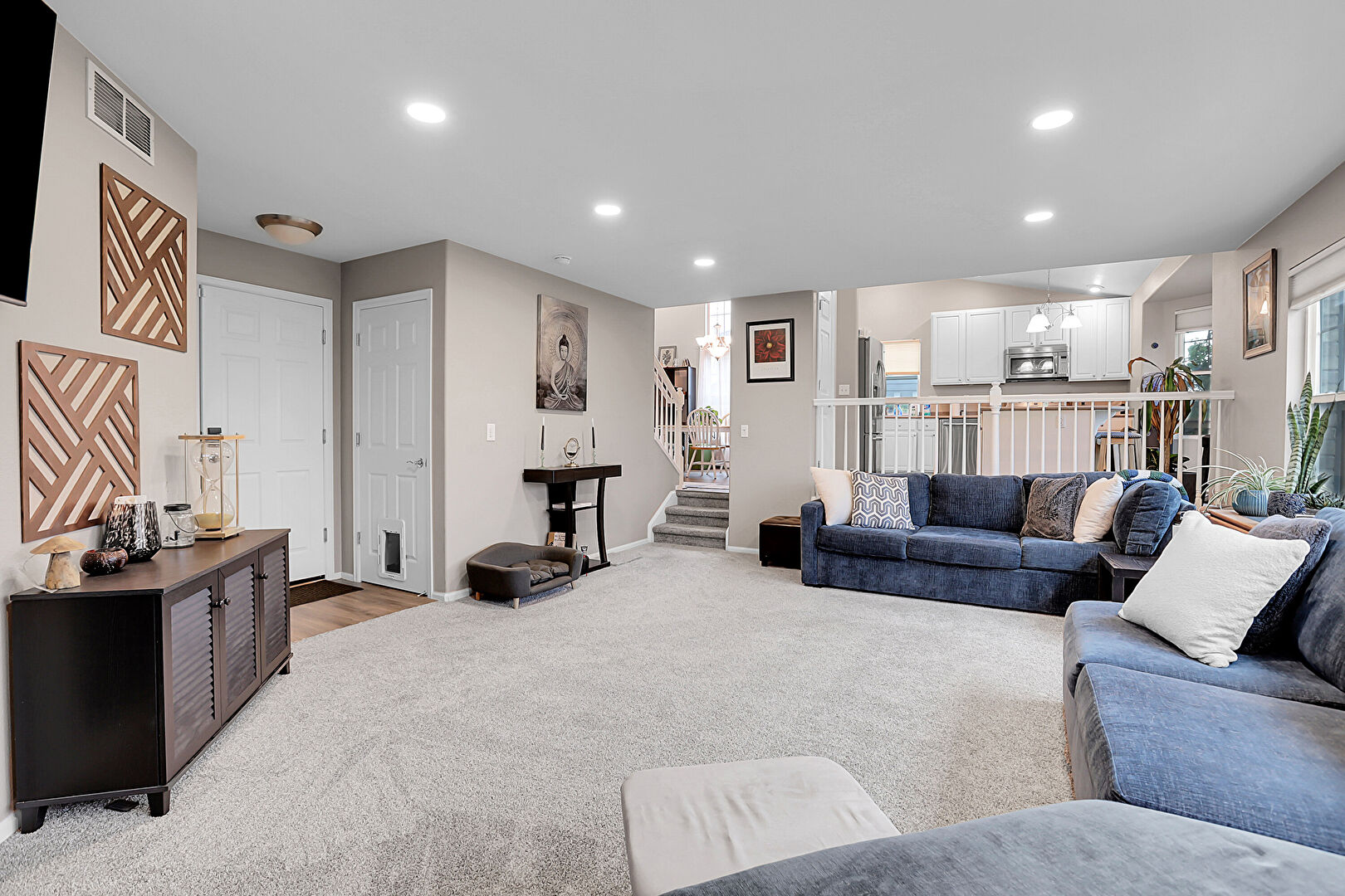 Baseboards Wall, Carpet, Drywall, Fireplace, Natural Light, Recessed Lighting, Stairs, Vent, Wood Finish Floor, Baseboards Wall, Carpet, Recessed Lighting, Vent
