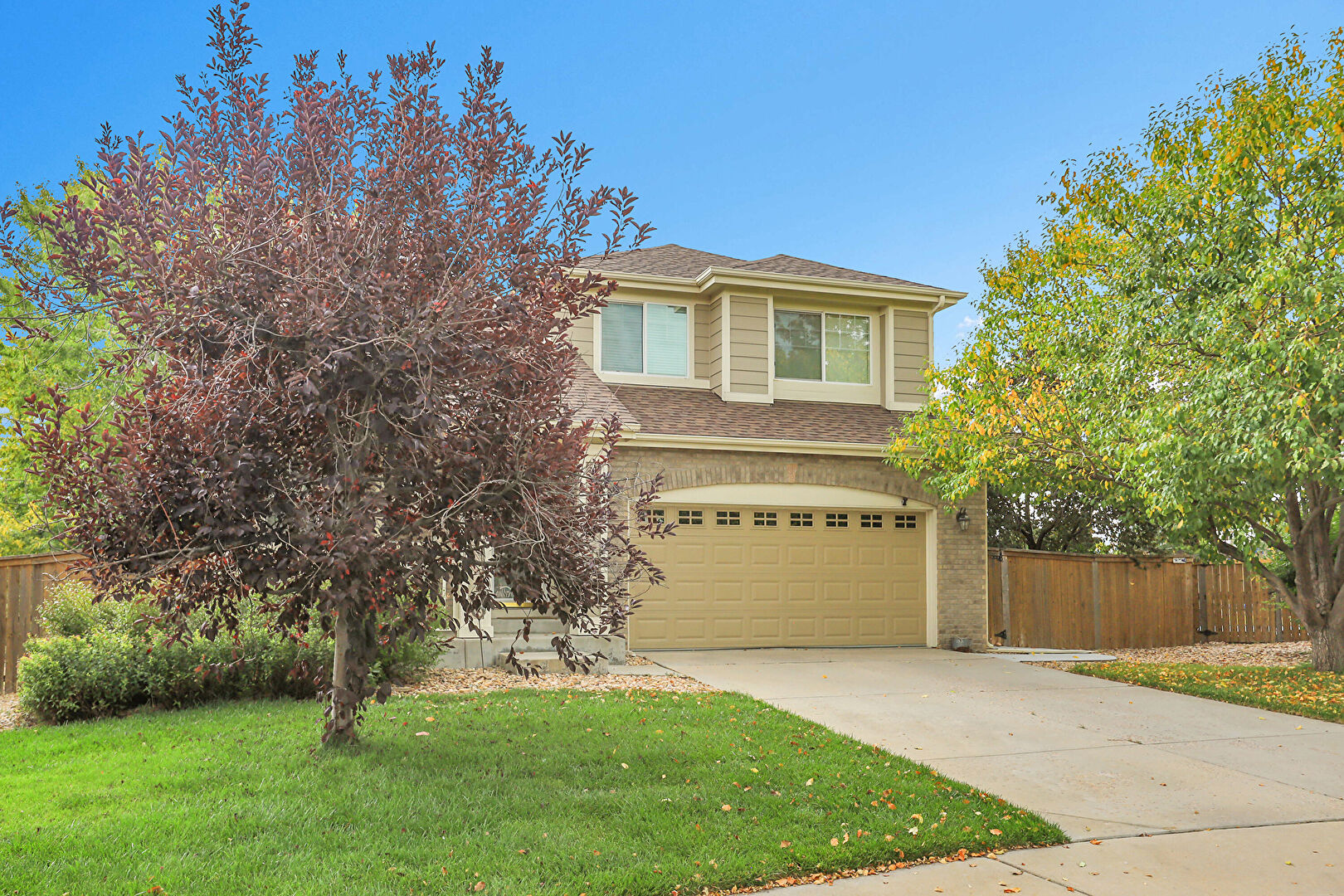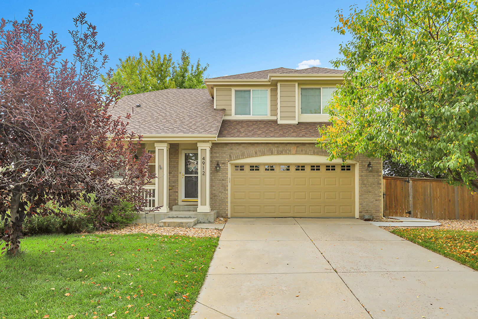 Brick Siding, Built In Garage, Concrete Foundation, Downspout, Driveway, Fence, Gutters, Horizontal Siding, Lawn, Shingle Roof, Stoop, Driveway, Lawn, Stoop