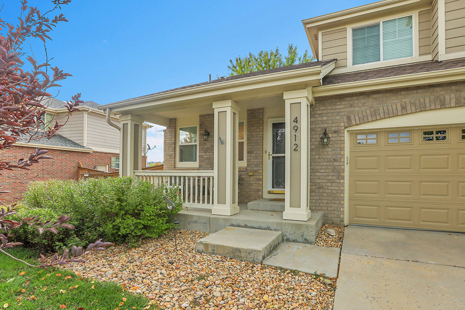 Brick Siding, Built In Garage, Downspout, Driveway, Gutters, Horizontal Siding, Porch