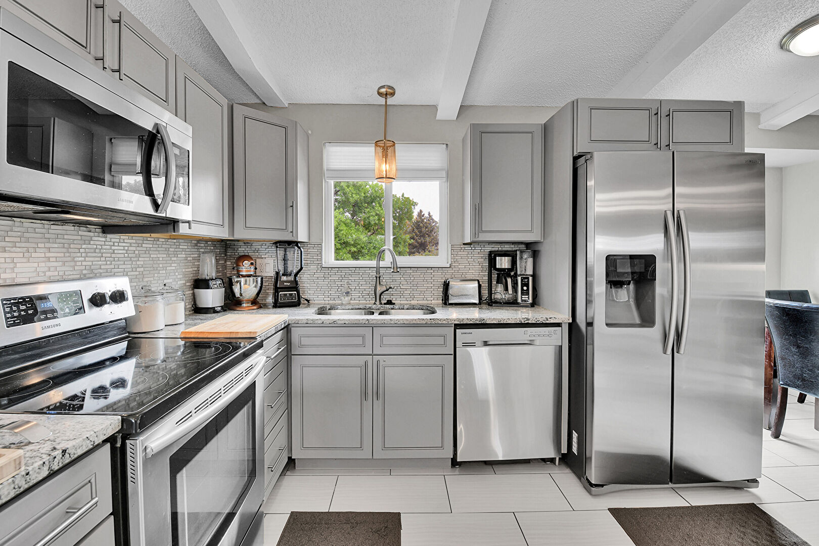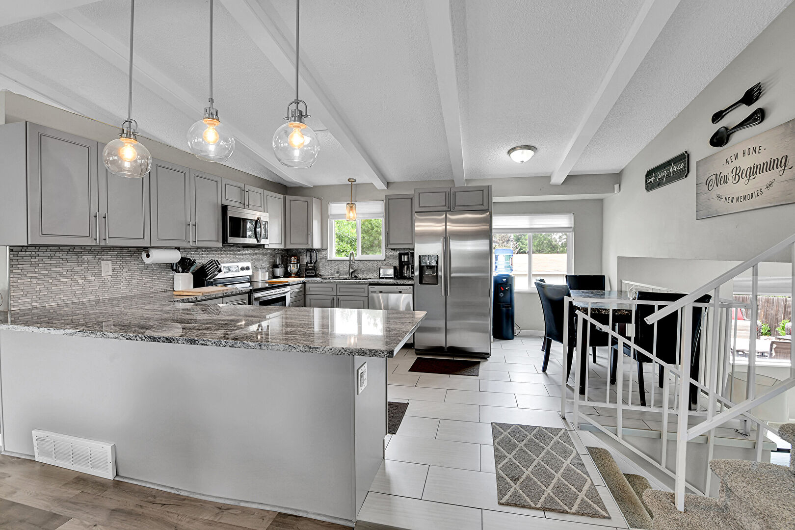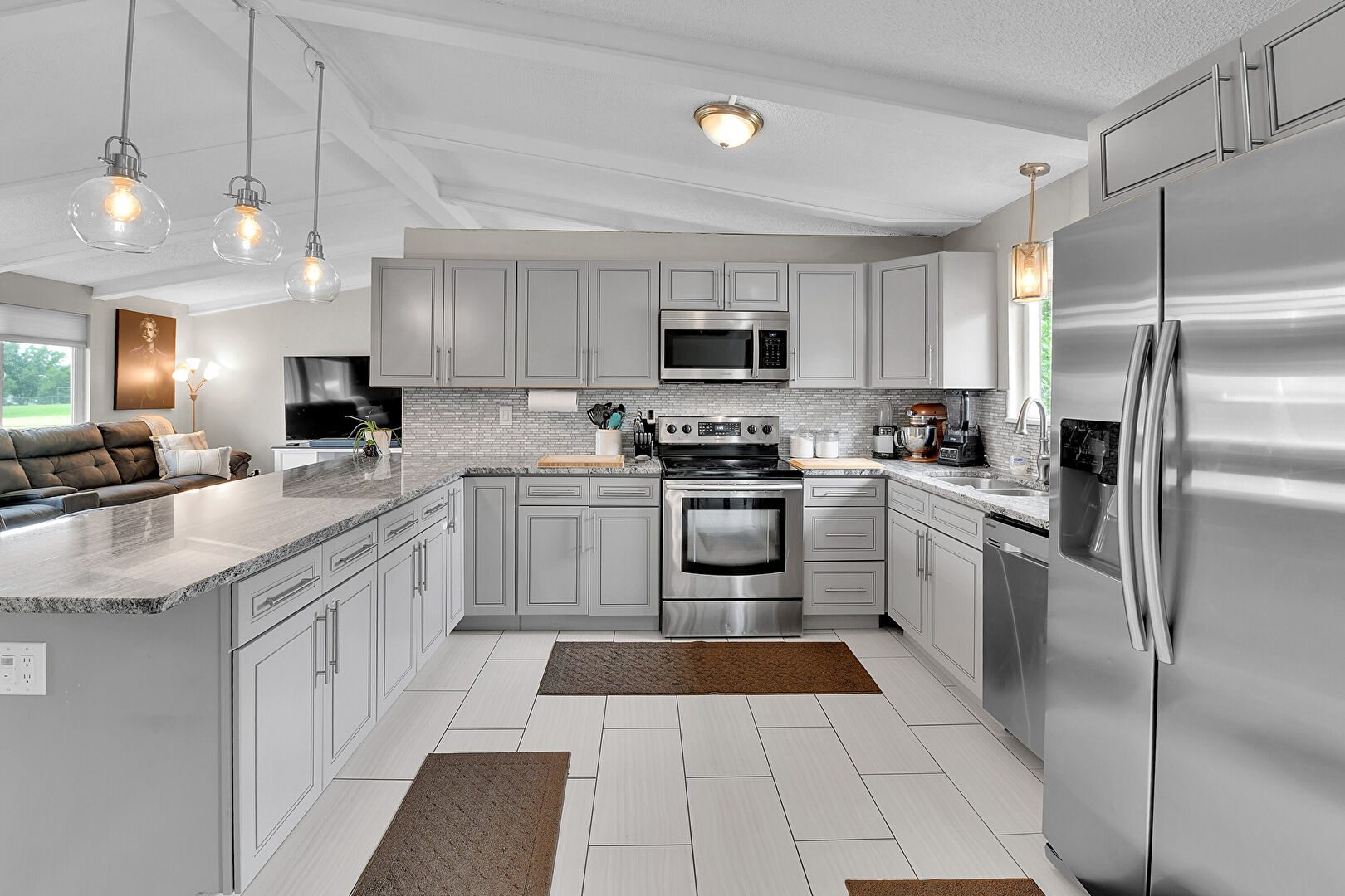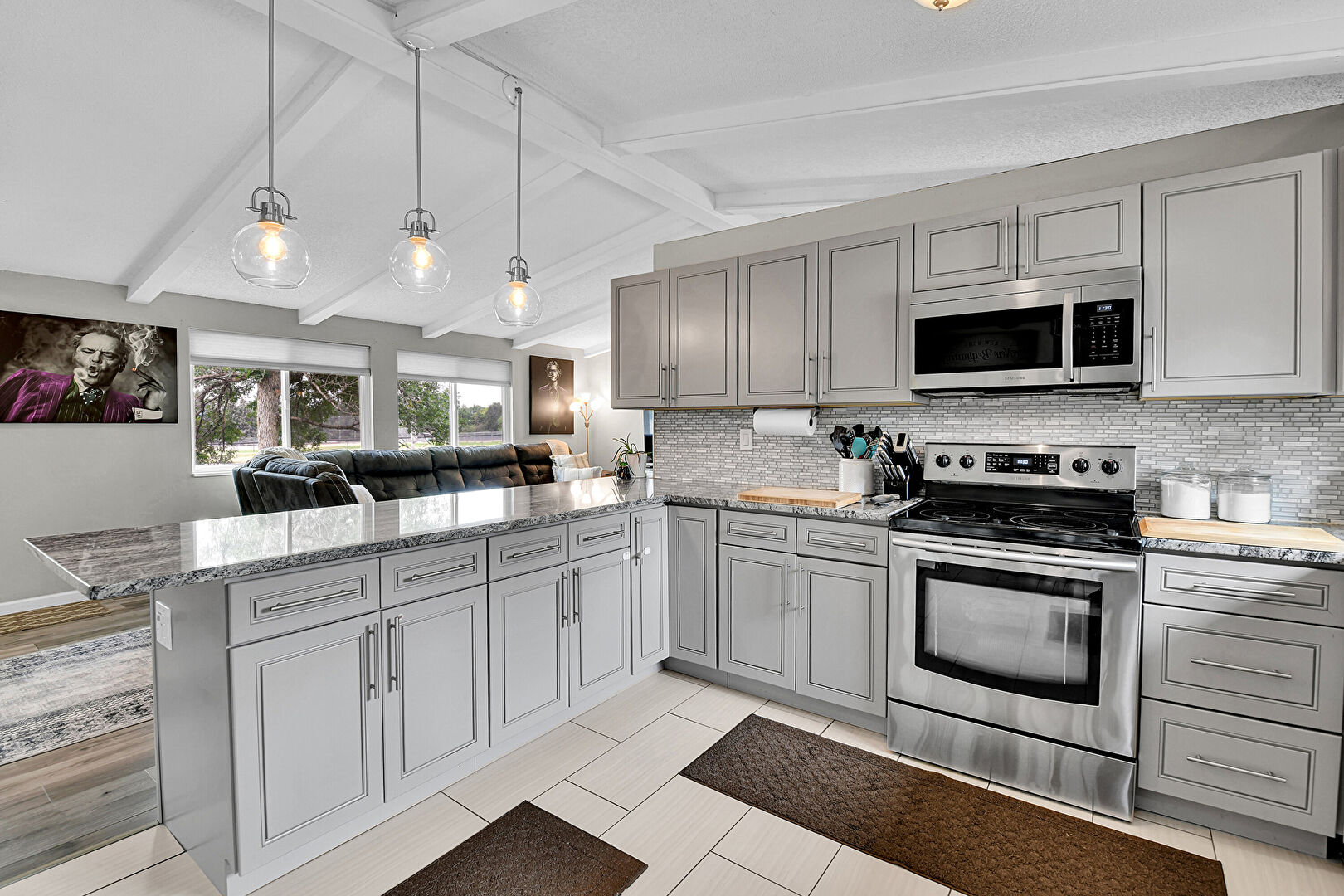Baseboards Wall, Beamed Ceiling, Cathedral Ceiling, Drywall, Gray Cabinets, Kitchen Peninsula, Natural Light, Opens To Living Area, Pendant Lighting, Raised Cabinets, Stone Countertops, Tile Floor, U Shaped Kitchen, Vaulted Ceiling, Vent, Beamed Ceiling, Gray Cabinets, Textured Ceiling, Tile Floor