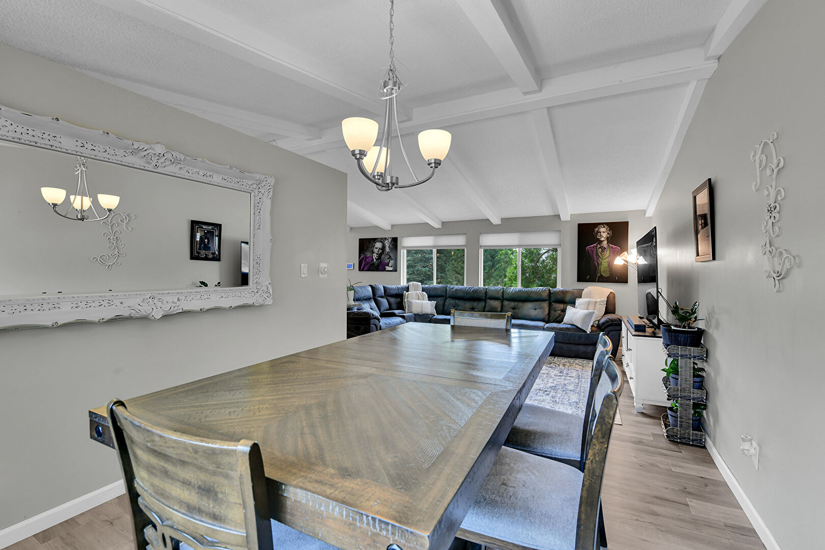 Baseboards Wall, Beamed Ceiling, Drywall, Natural Light, Notable Chandelier, Textured Ceiling, Vaulted Ceiling, Wood Finish Floor, Drywall, Natural Light