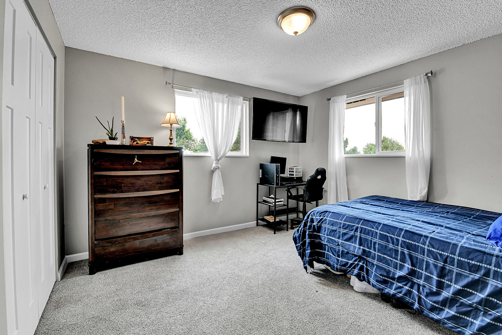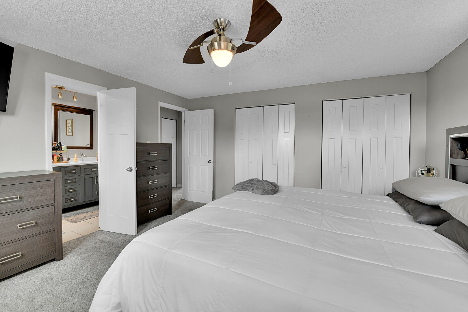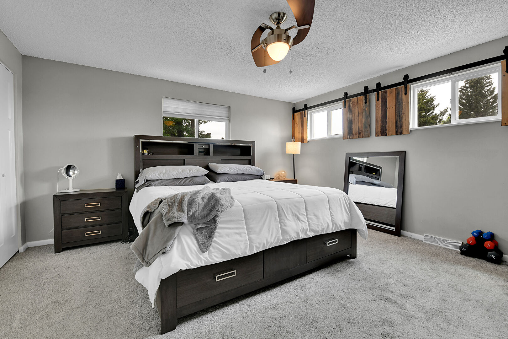 Barn Door, Baseboards Wall, Carpet, Ceiling Fan, Drywall, Textured Ceiling, Two Closets, Vent, Ensuite Bathroom, Natural Light