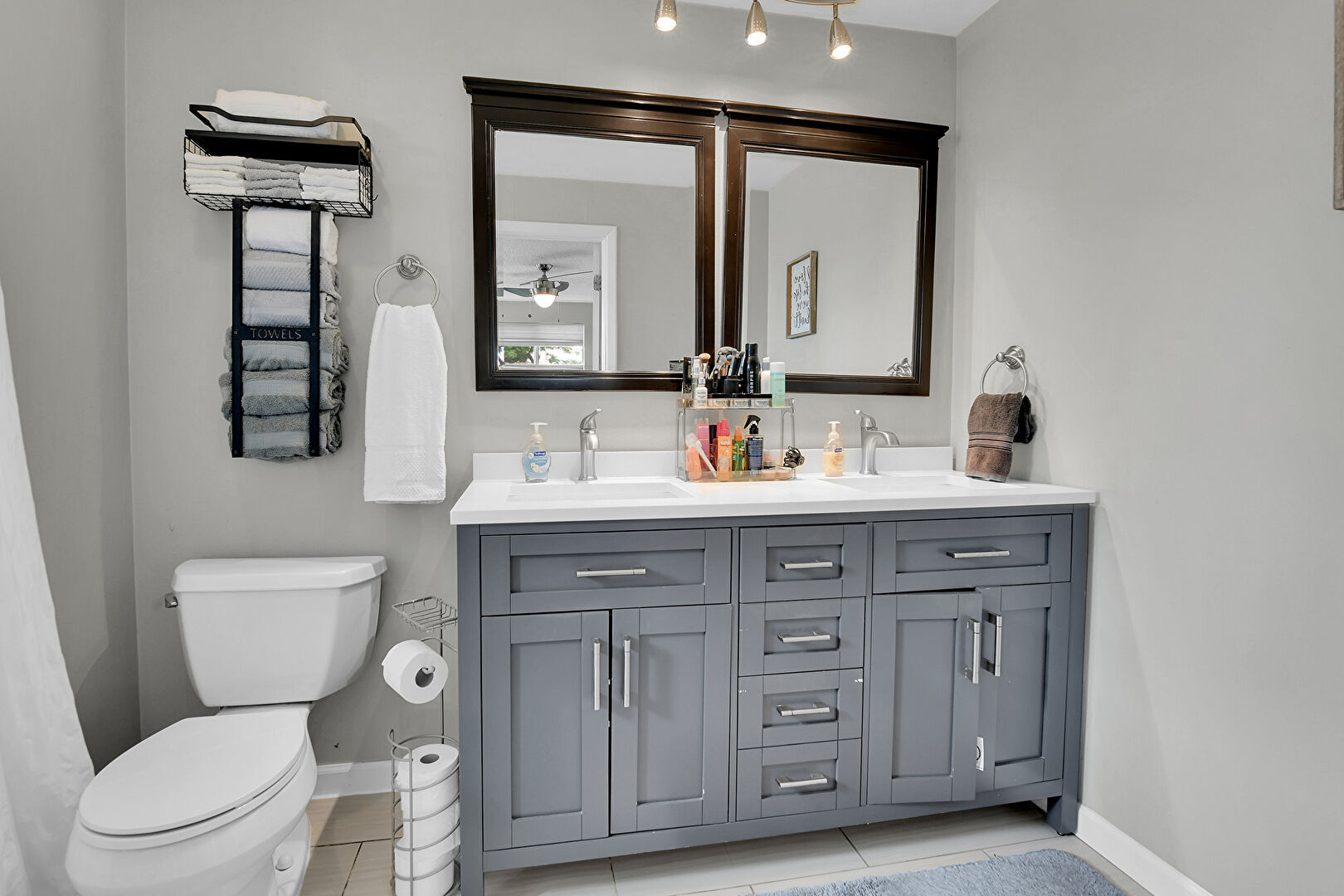 Baseboards Wall, Double Vanity, Drywall, Full Bathroom, Natural Light, Tile Floor, Vanity, Full Bathroom, Tile Floor