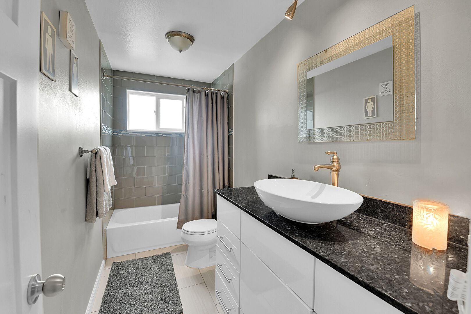Baseboards Wall, Combined Bath Shower, Drywall, Half Bathroom, Natural Light, Tile Floor, Vanity, Full Bathroom, Wood Finish Floor