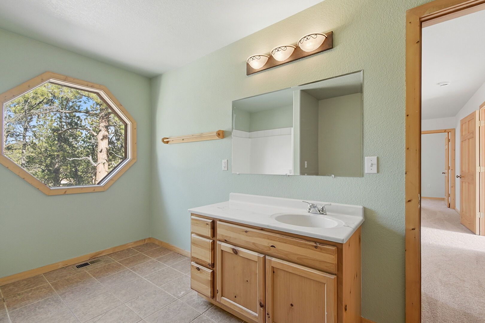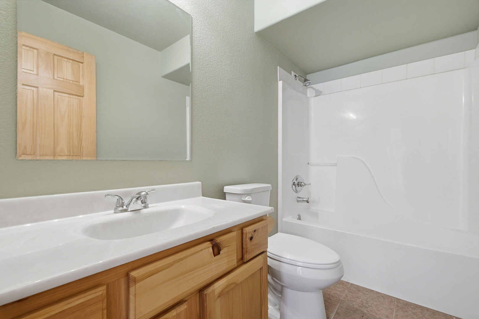 Baseboards Wall, Combined Bath Shower, Drywall, Full Bathroom, Natural Light, Textured Ceiling, Textured Wall, Tile Floor, Vanity, Vent, Combined Bath Shower, Full Bathroom, Tile Floor, Vanity