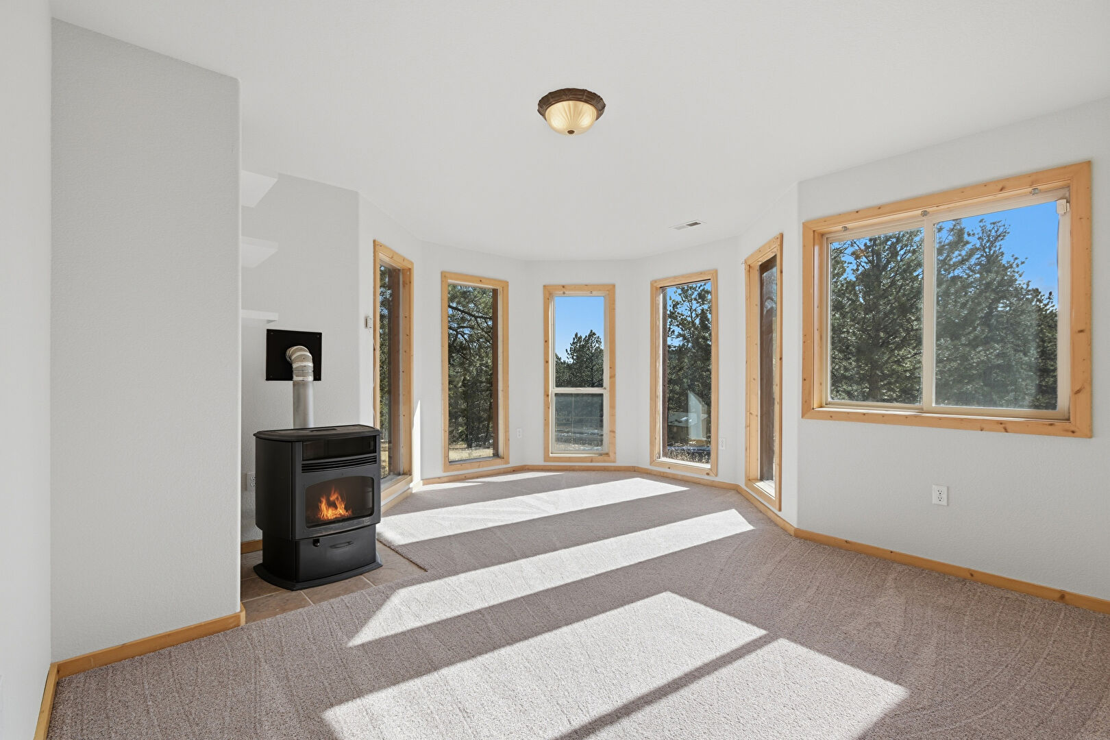 Baseboards Wall, Carpet, Drywall, Natural Light, Office Area, Textured Ceiling, Wood Stove, Baseboards Wall, Drywall