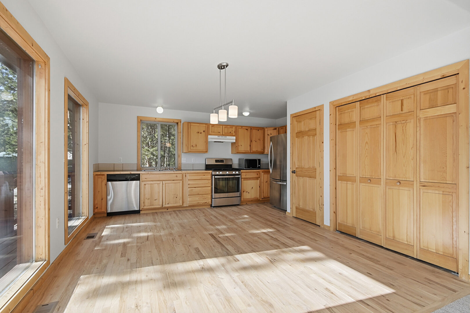 Baseboards Wall, Carpet, Drywall, L Shaped Kitchen, Natural Light, Pendant Lighting, Shaker Cabinets, Smoke Carbon Monoxide Detector, Vaulted Ceiling, Vent, Wood Finish Floor, Natural Light, Pendant Lighting, Wood Finish Floor