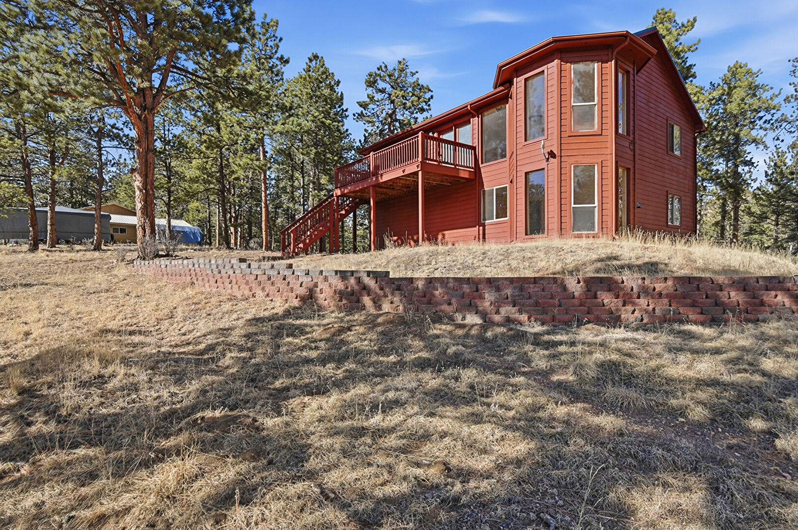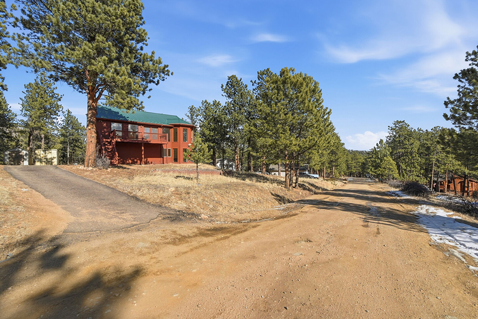 Basement Walk Out, Deck, Downspout, Driveway, Gutters, Horizontal Siding, Lawn, Metal Roof, Outdoor Structure, Shed, Stairs, Standing Seam Roof, Woods View, Basement Walk Out, Horizontal Siding