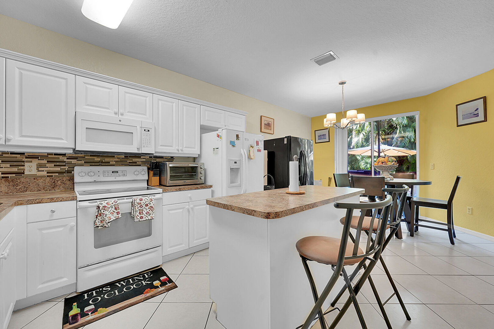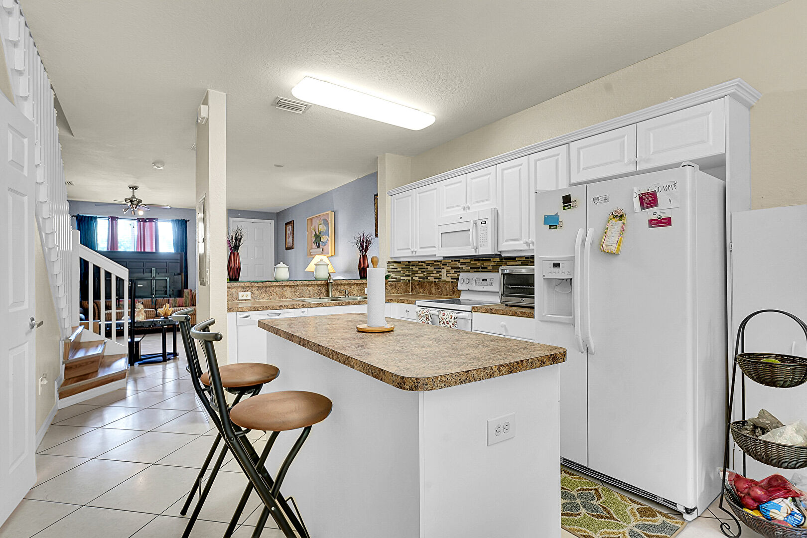 Baseboards Wall, Ceiling Fan, Crown Molding Cabinets, Drywall, Kitchen Bar, Kitchen Island, Kitchen Peninsula, L Shaped Kitchen, Natural Light, Notable Chandelier, Opens To Living Area, Pendant Lighting, Raised Cabinets, Textured Ceiling, Tile Floor, Toaster, Vent, Drywall, Toaster, Vent