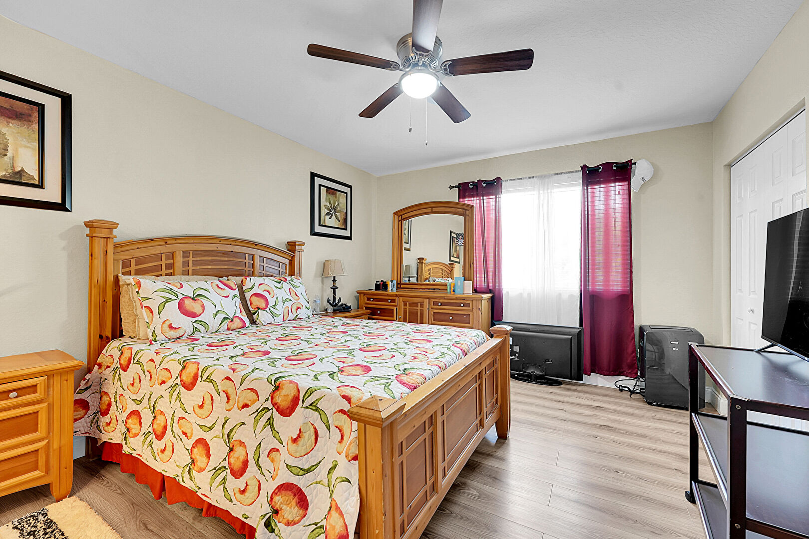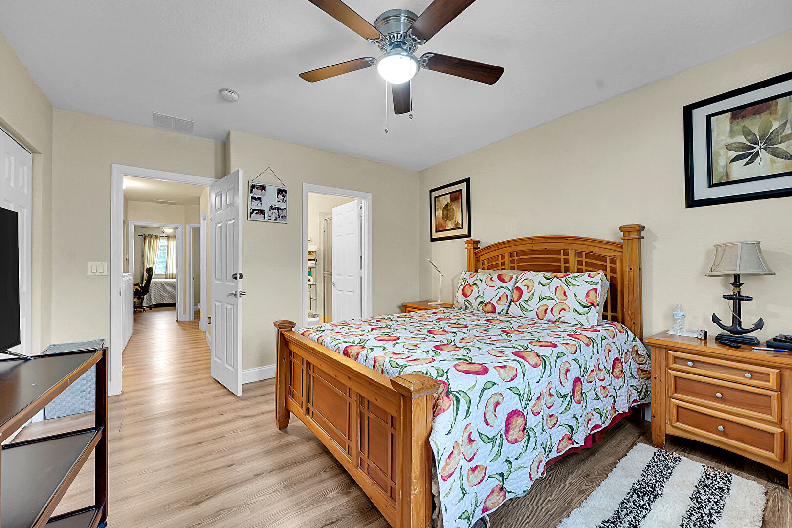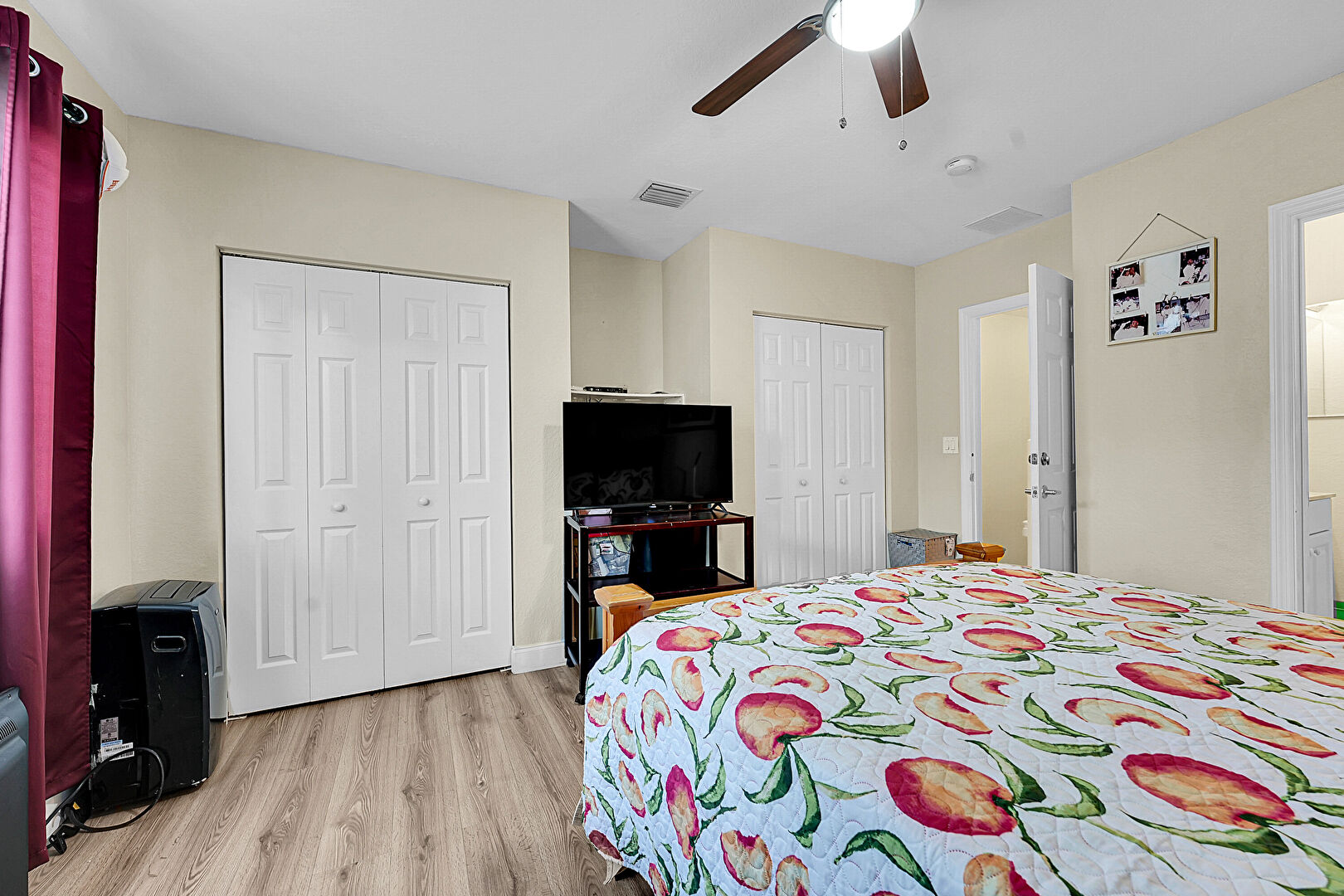 Baseboards Wall, Ceiling Fan, Closet, Drywall, Ensuite Bathroom, Natural Light, Two Closets, Vent, Wood Finish Floor, Baseboards Wall, Ceiling Fan, Wood Finish Floor