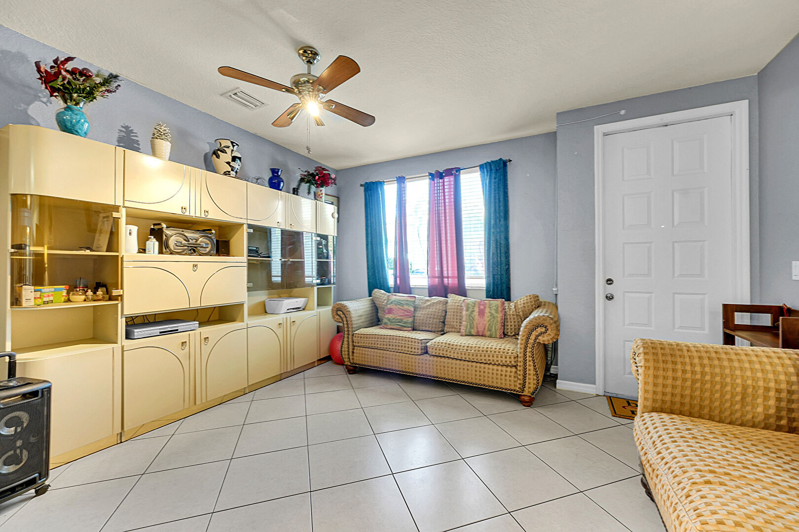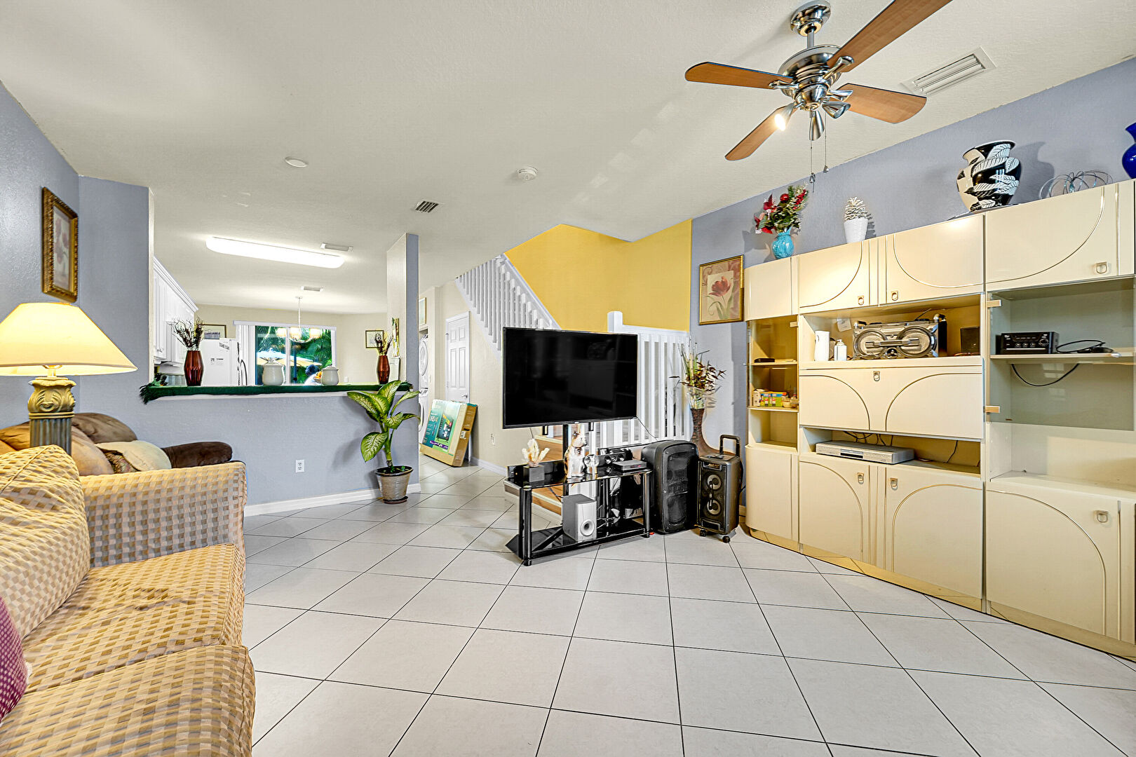 Baseboards Wall, Ceiling Fan, Drywall, Natural Light, Notable Chandelier, Pass Through Window, Pendant Lighting, Textured Ceiling, Tile Floor, Vent, Ceiling Fan, Drywall, Tile Floor