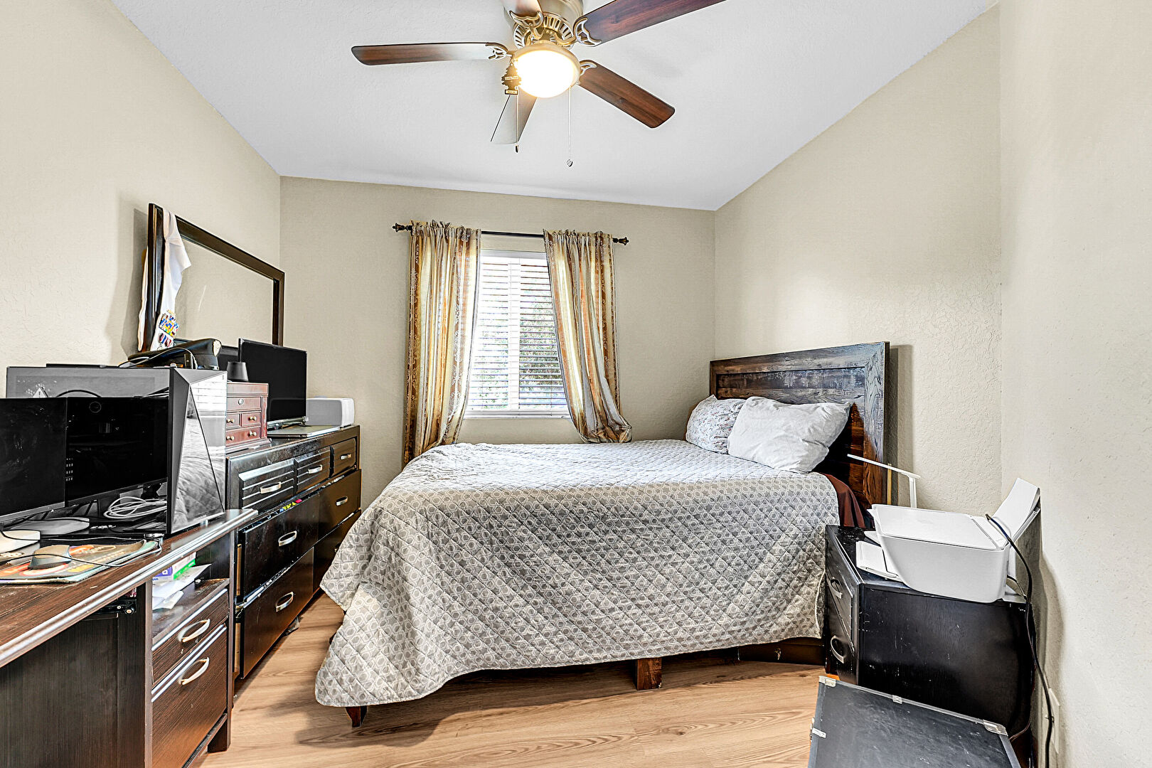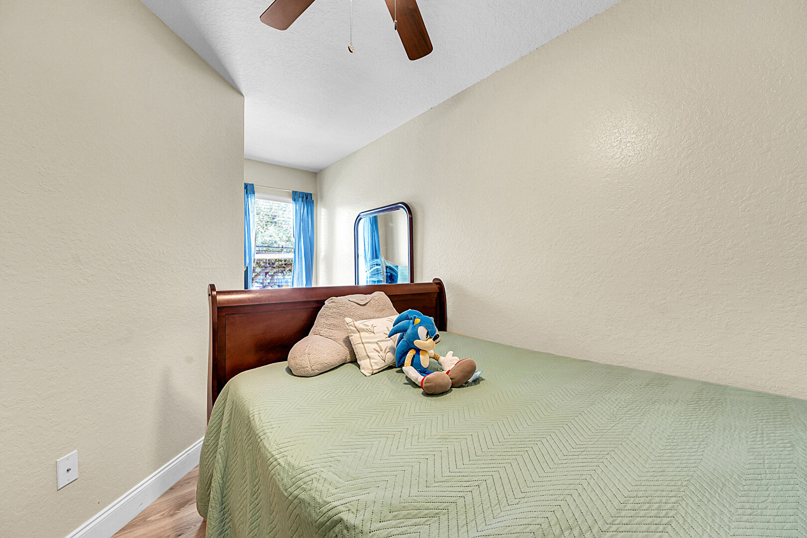 Baseboards Wall, Ceiling Fan, Drywall, Textured Ceiling, Textured Wall, Wood Finish Floor, Natural Light