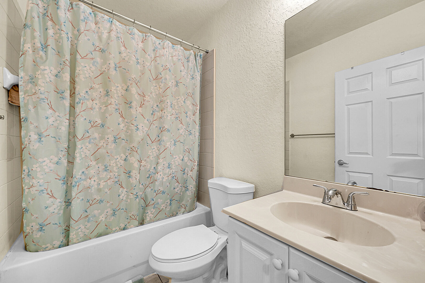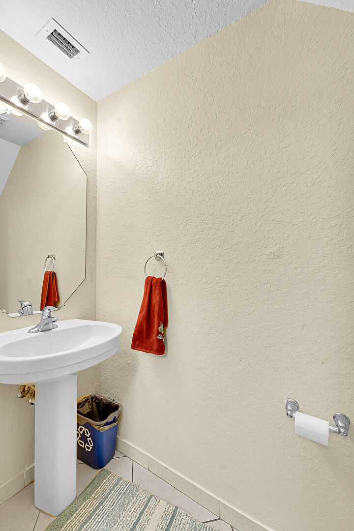 Combined Bath Shower, Half Bathroom, Textured Ceiling, Textured Wall, Tile Floor, Vanity, Vent, Baseboards Wall, Full Bathroom