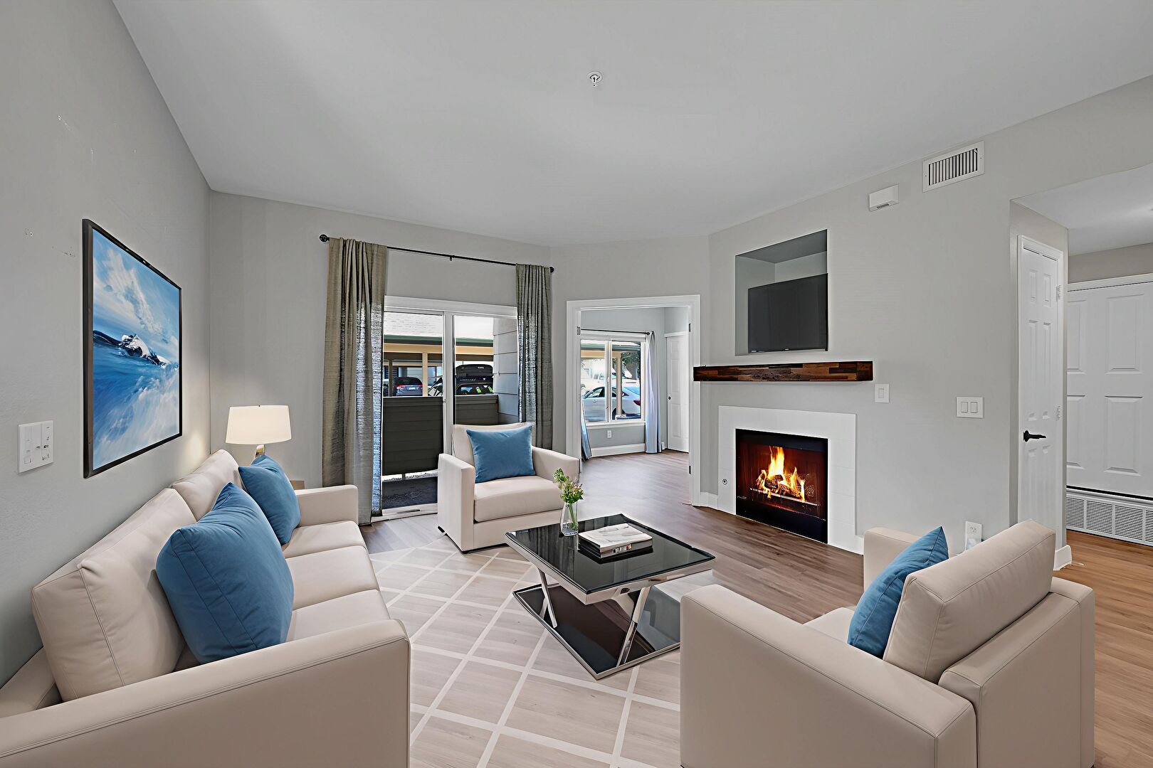 Baseboards Wall, Drywall, Fireplace, Natural Light, Notable Chandelier, Recessed Lighting, Vent, Wood Finish Floor, Recessed Lighting, Wood Finish Floor
