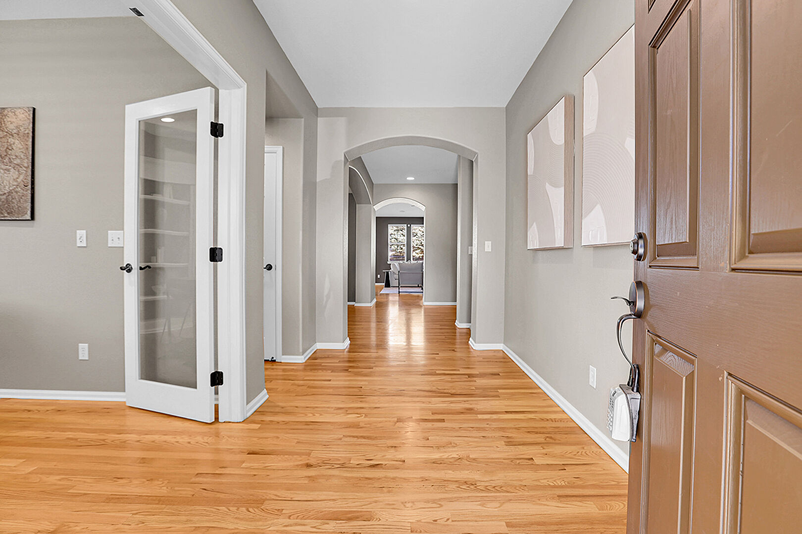 Arched Walkways, Baseboards Wall, Drywall, Natural Light, Recessed Lighting, Textured Wall, Wood Finish Floor, Natural Light, Wood Finish Floor