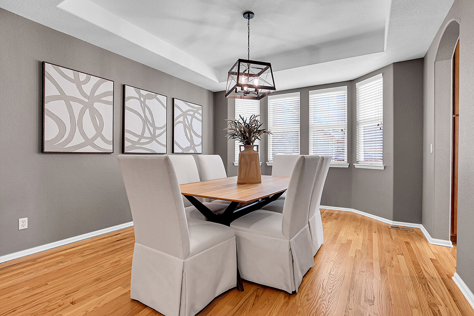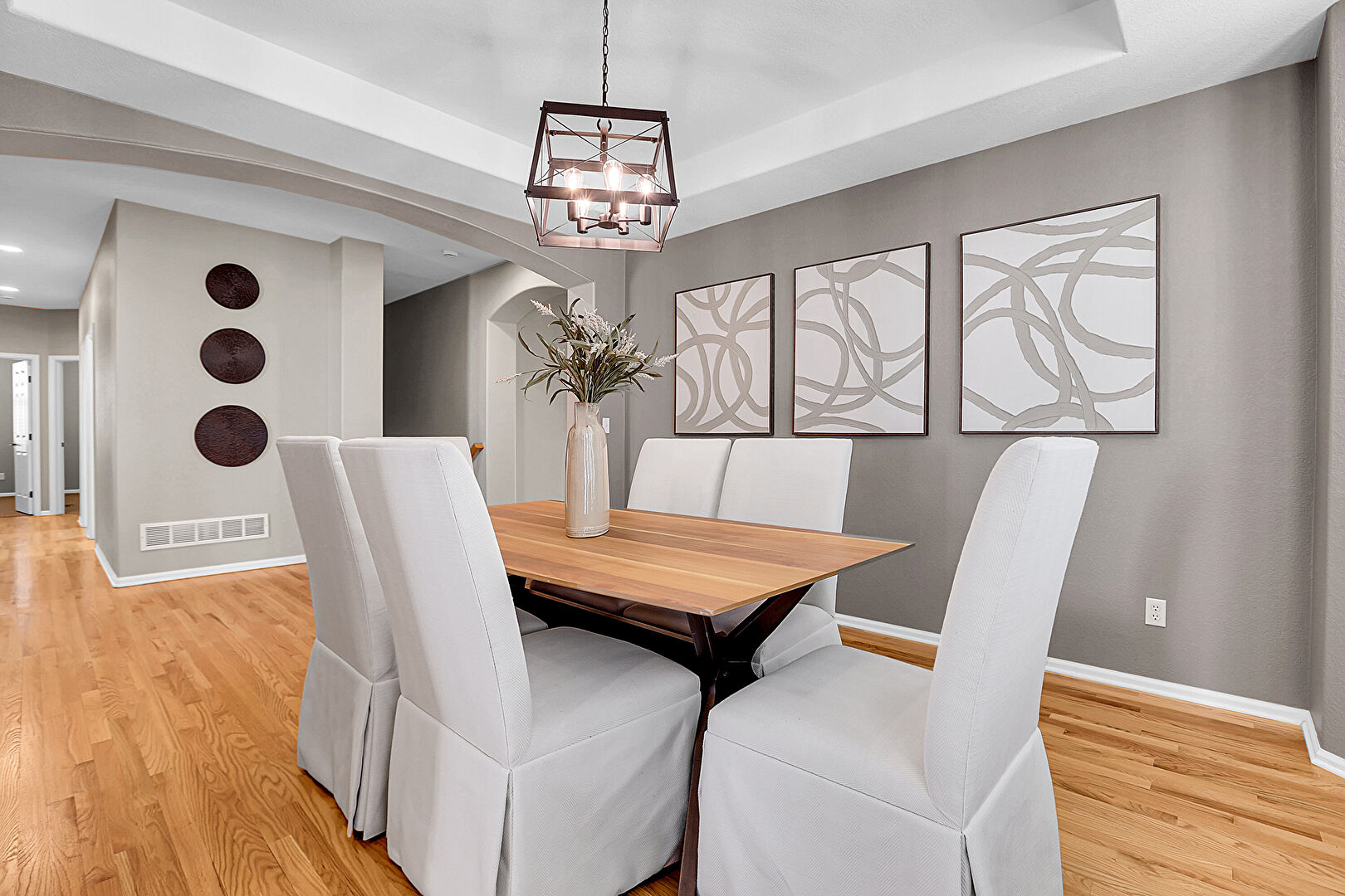 Arched Walkways, Baseboards Wall, Drywall, Natural Light, Notable Chandelier, Office Area, Recessed Lighting, Textured Wall, Tray Ceiling, Vent, Wood Finish Floor, Natural Light, Notable Chandelier, Wood Finish Floor