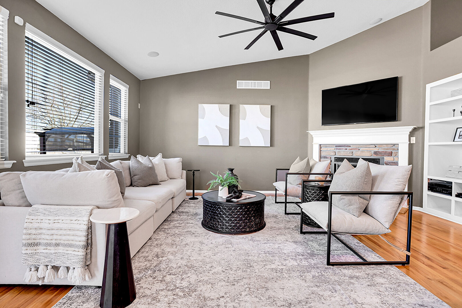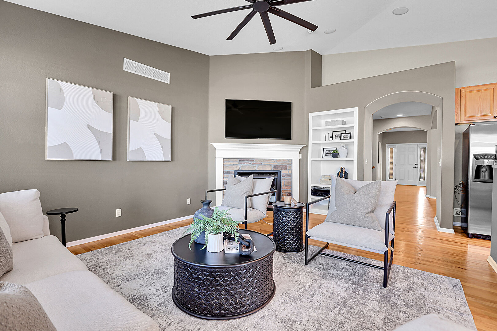 Arched Walkways, Baseboards Wall, Built In Shelves, Ceiling Fan, Drywall, Fireplace, High Ceiling, Natural Light, Notable Chandelier, Recessed Lighting, Vaulted Ceiling, Vent, Wood Finish Floor, Built In Shelves, Ceiling Fan, High Ceiling, Natural Light, Vaulted Ceiling, Vent