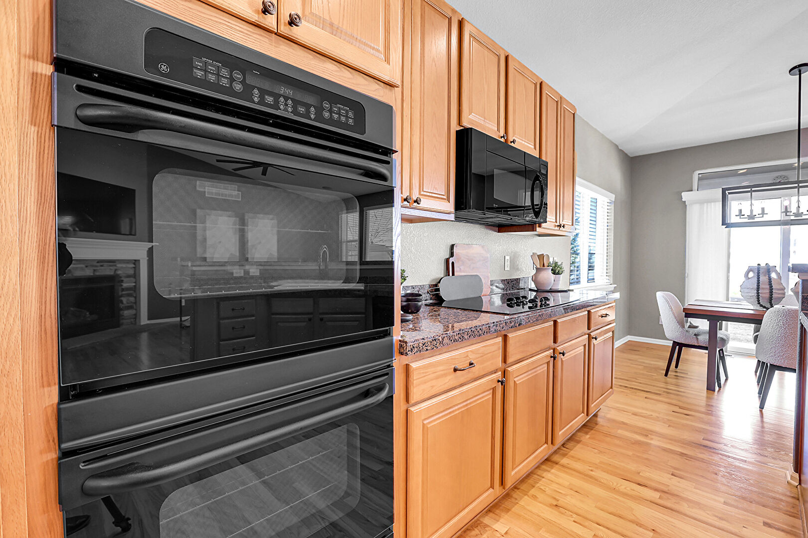 Arched Walkways, Baseboards Wall, Ceiling Fan, Double Oven, Drywall, Fireplace, Kitchen Bar, Kitchen Peninsula, Medium Brown Cabinets, Natural Light, Notable Chandelier, Opens To Living Area, Pendant Lighting, Raised Cabinets, Recessed Lighting, Stone Countertops, Stone Tile Countertops, Tile Floor, Vaulted Ceiling, Vent, Wood Finish Floor, Baseboards Wall, Drywall, Kitchen Island, Stone Tile Countertops, Textured Wall