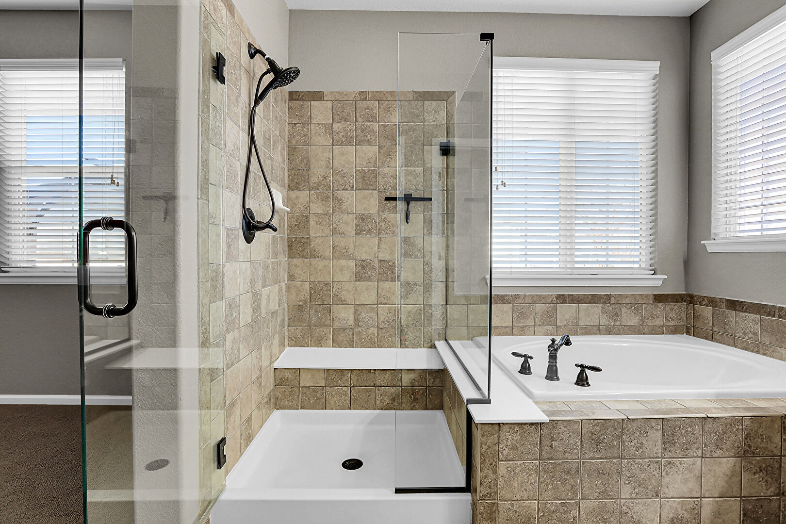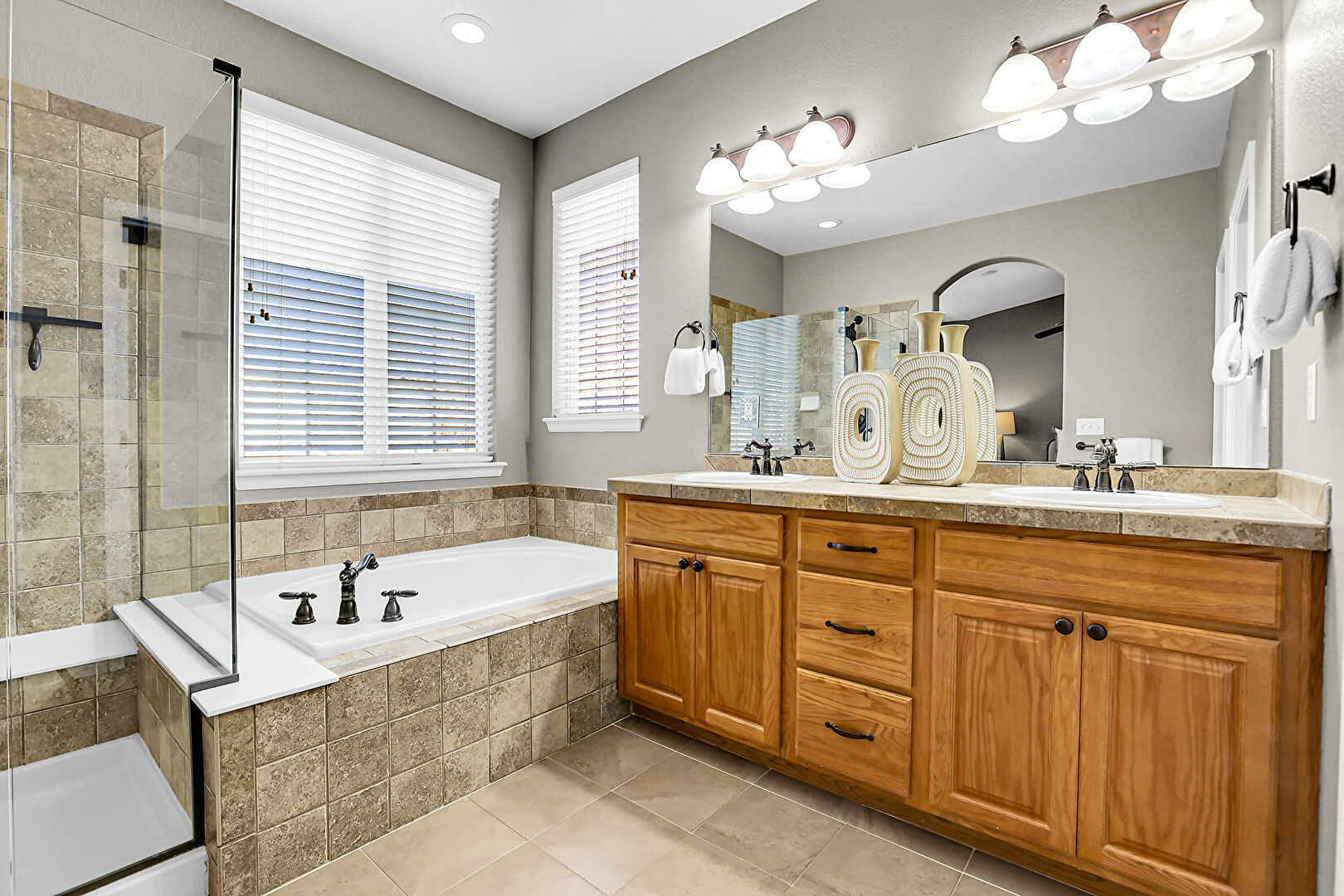 Baseboards Wall, Combined Bath Shower, Double Vanity, Drywall, Ensuite Bathroom, Full Bathroom, Recessed Lighting, Textured Wall, Tile Floor, Vanity, Walk In Closet, Wood Finish Floor, Baseboards Wall, Drywall, Natural Light, Textured Wall