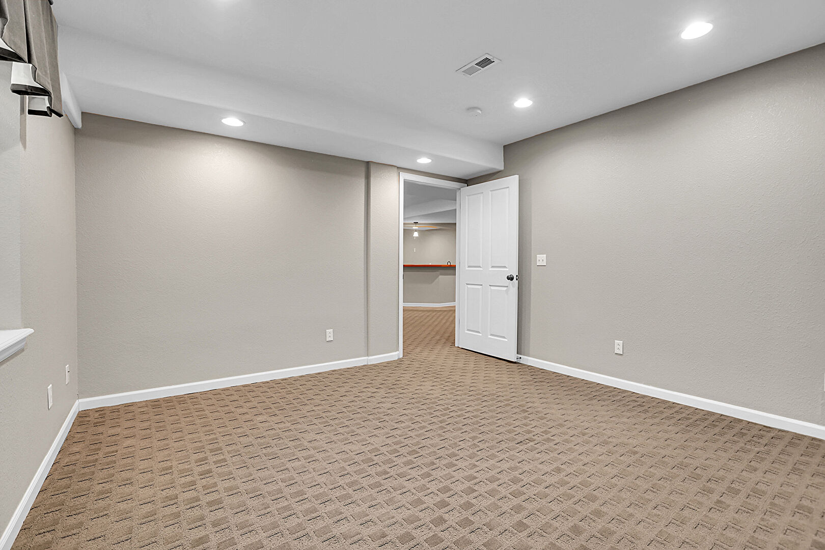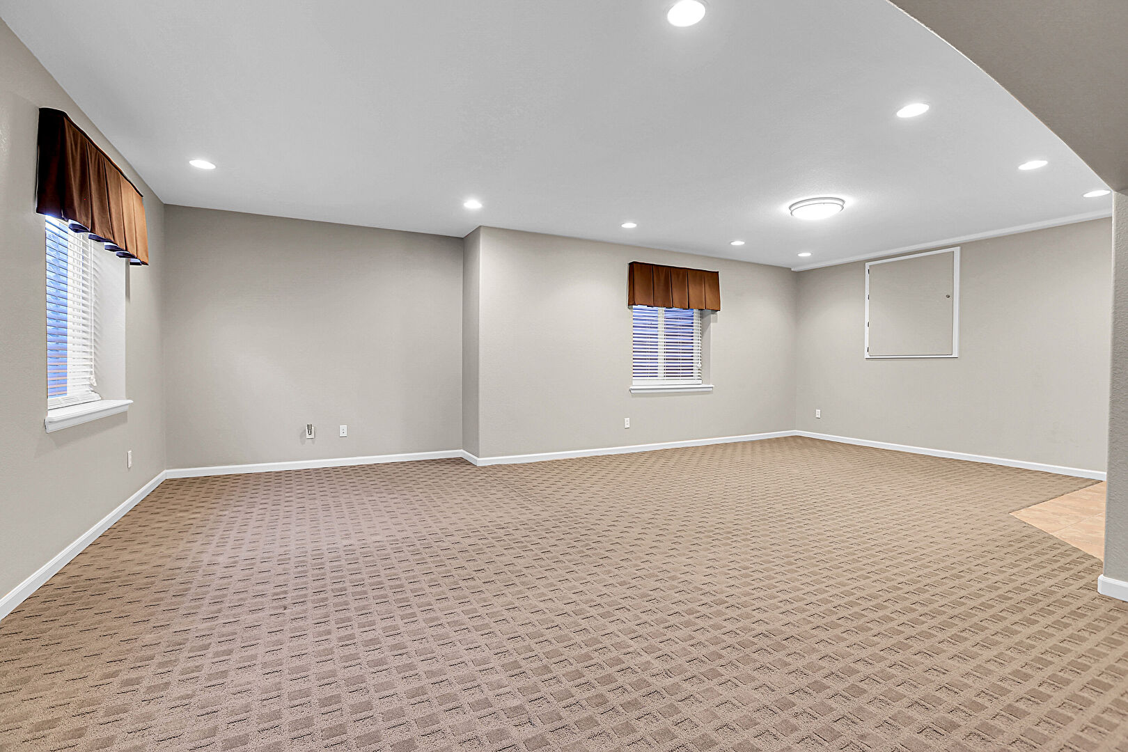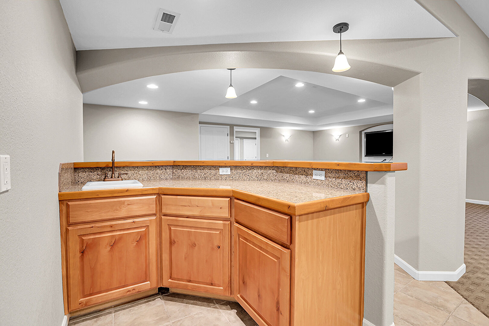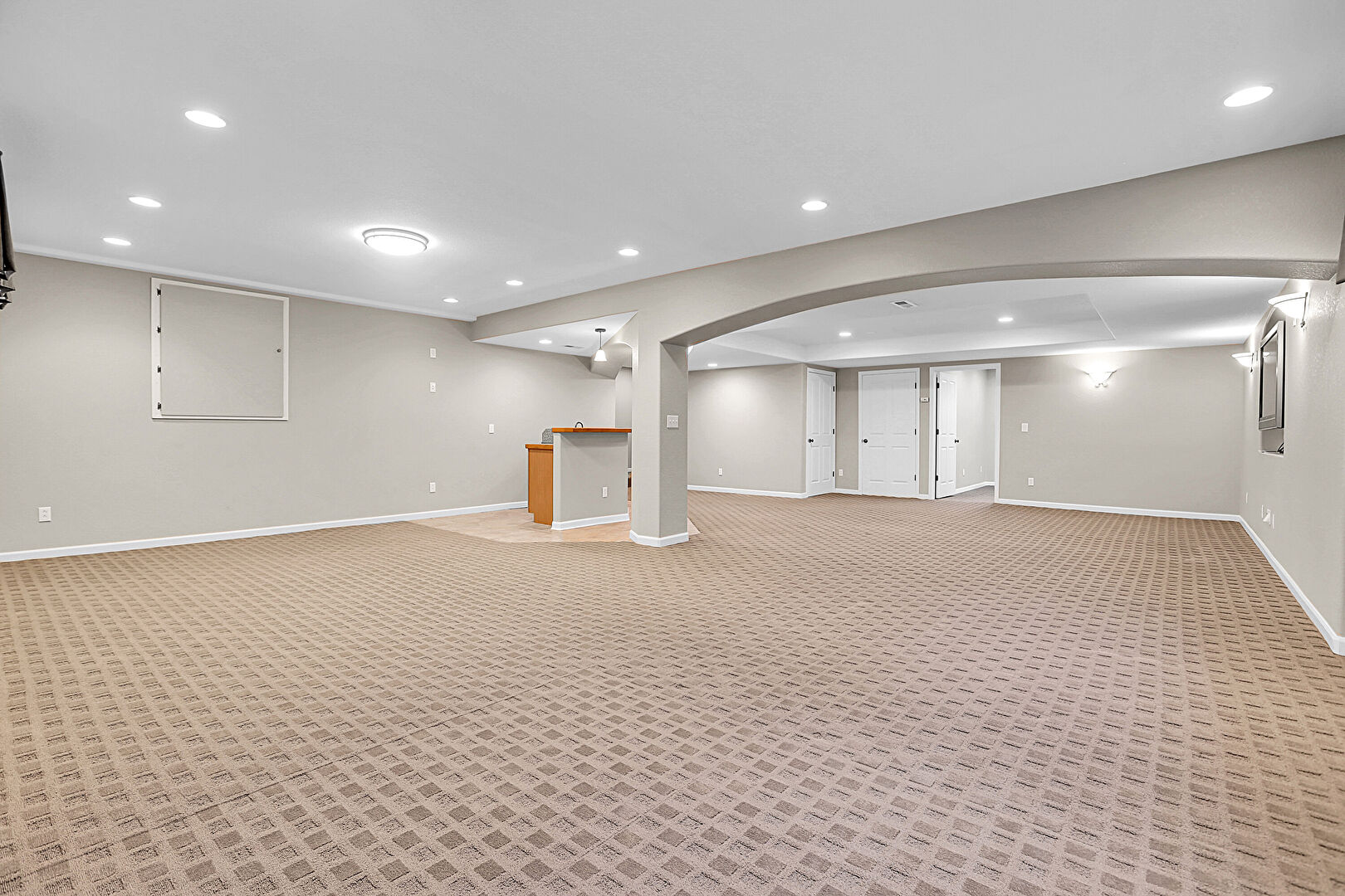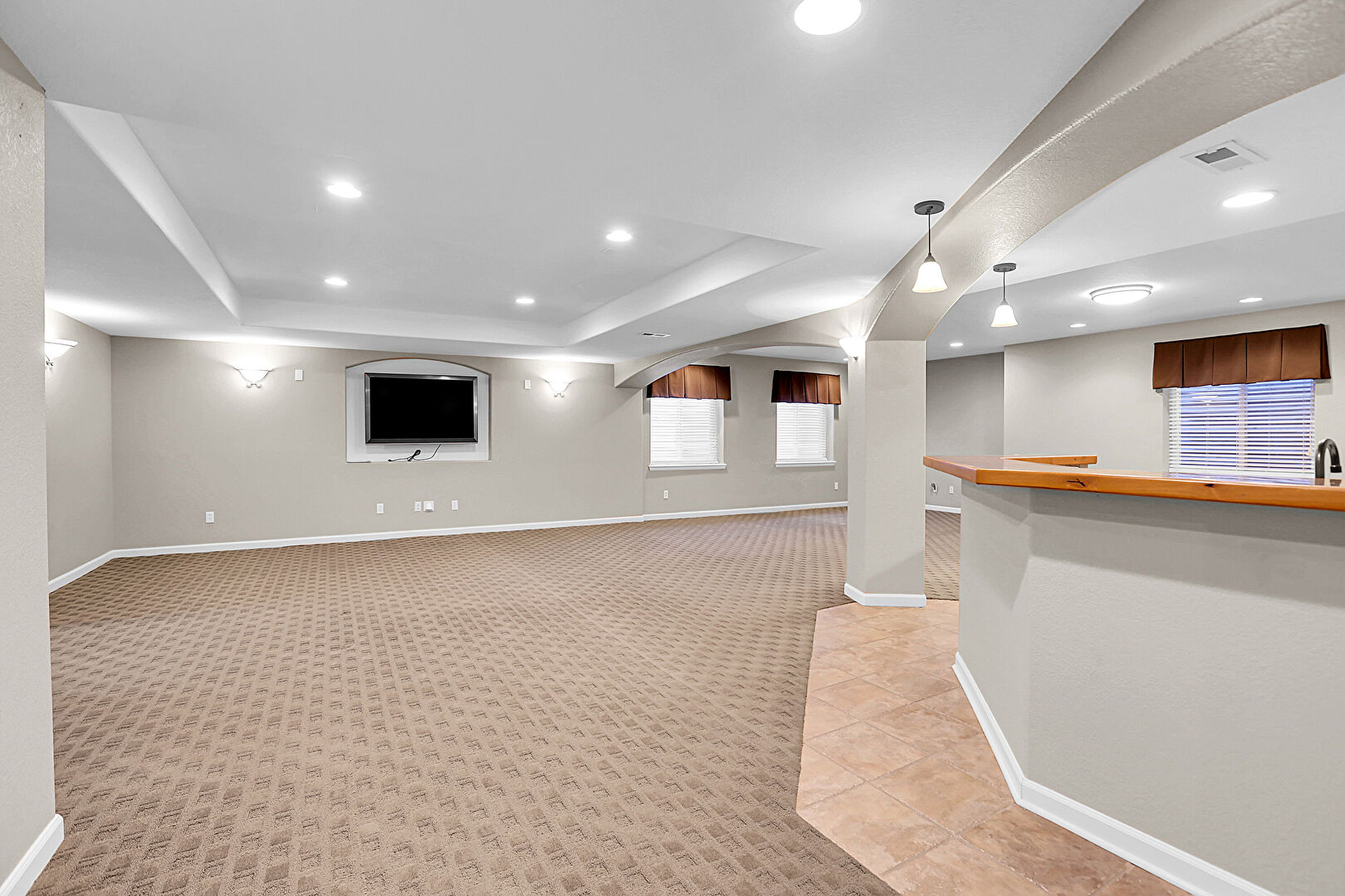 Arched Walkways, Baseboards Wall, Basement, Carpet, Drywall, Indoor Bar, Natural Light, Recessed Lighting, Tile Floor, Vent, Arched Walkways, Baseboards Wall, Basement, Vent