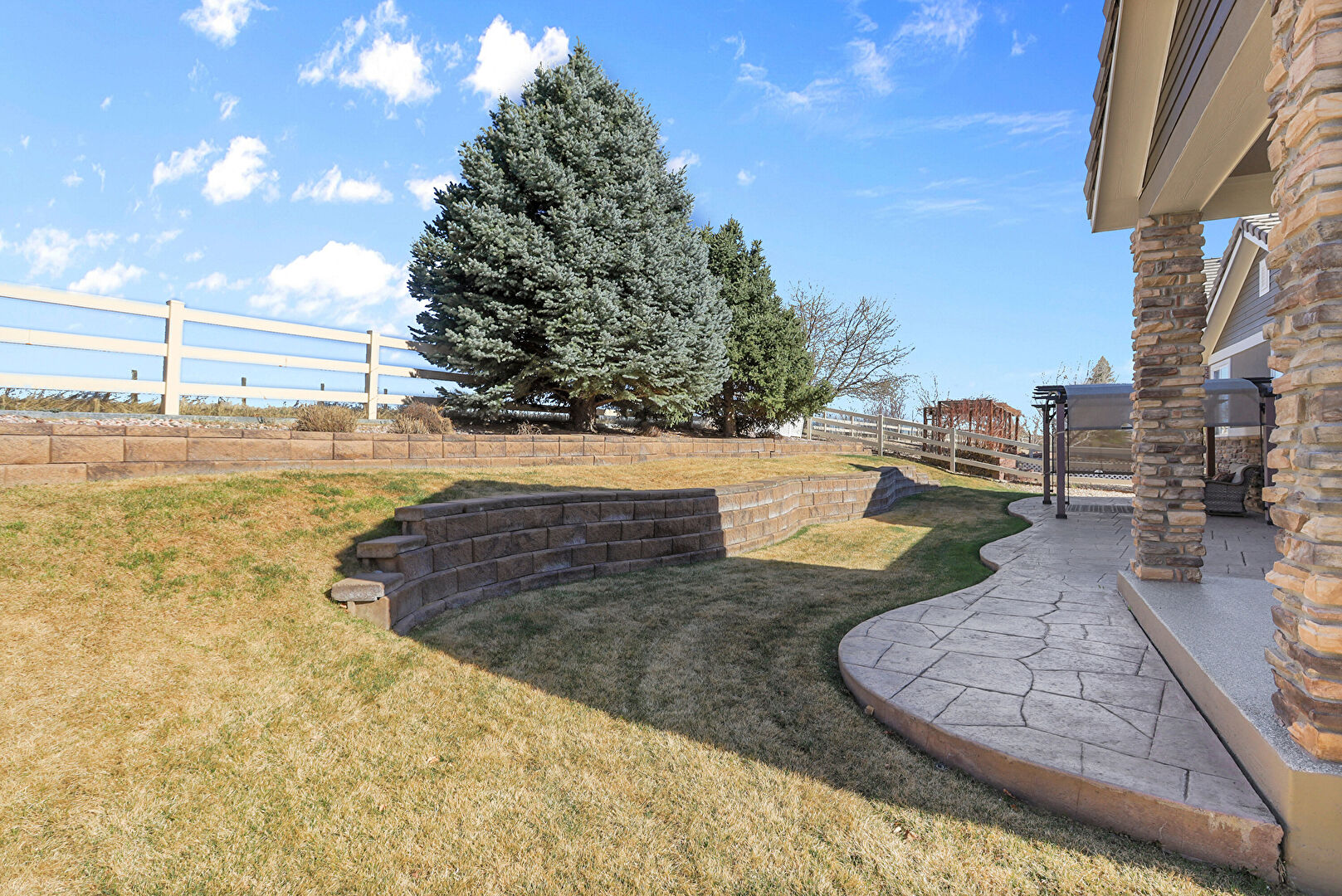 Fence, Lawn, Outdoor Living Space, Patio, Pergola, Grill, Lawn, Outdoor Living Space, Patio, Pergola